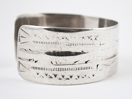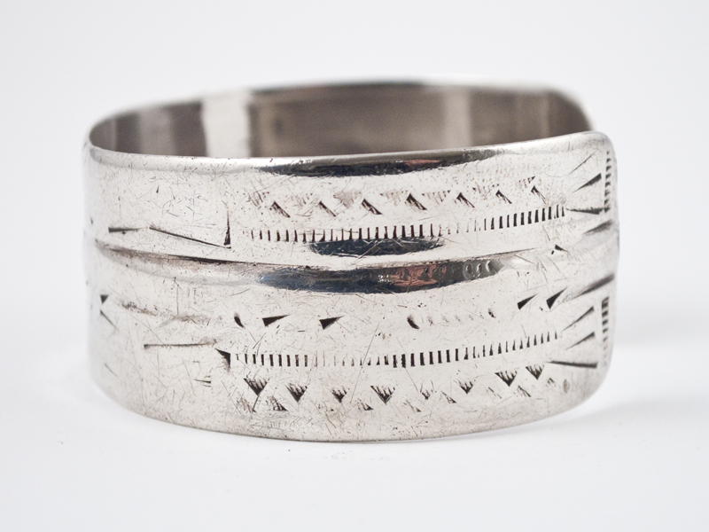 A silver cuff softened by decades of wear, this is one of a pair worn on each wrist by Bedouin women during their daily life. Inside there is a stamped "6" as a hallmark and it weighs 62 grams.