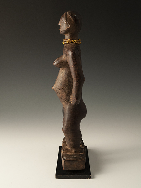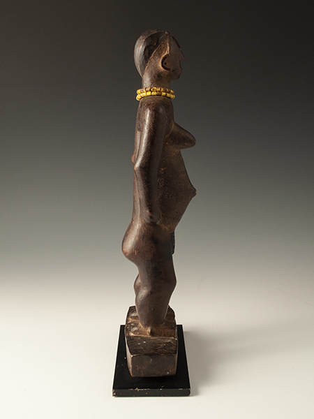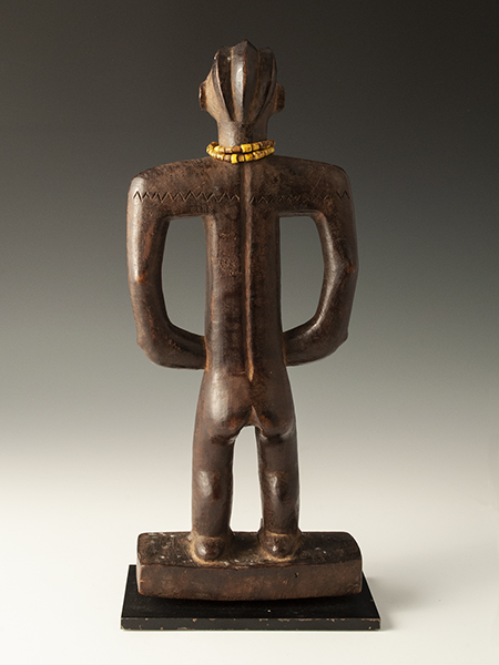 Standing with hands on hips, arms akimbo, this female figure wears a modesty apron and a yellow bead necklace. The shoulders are incised with zig-zag scarification front and back. Rich patina.
