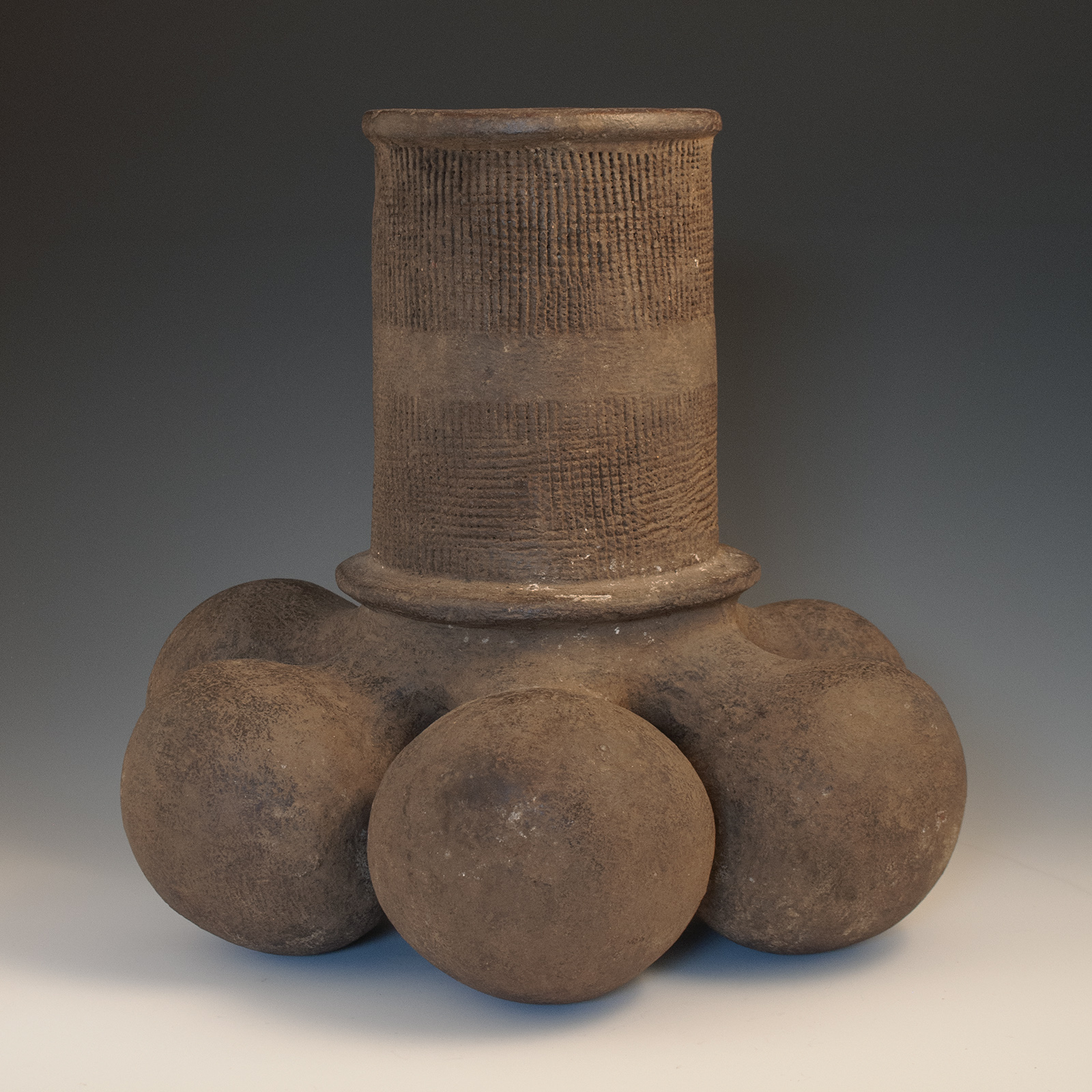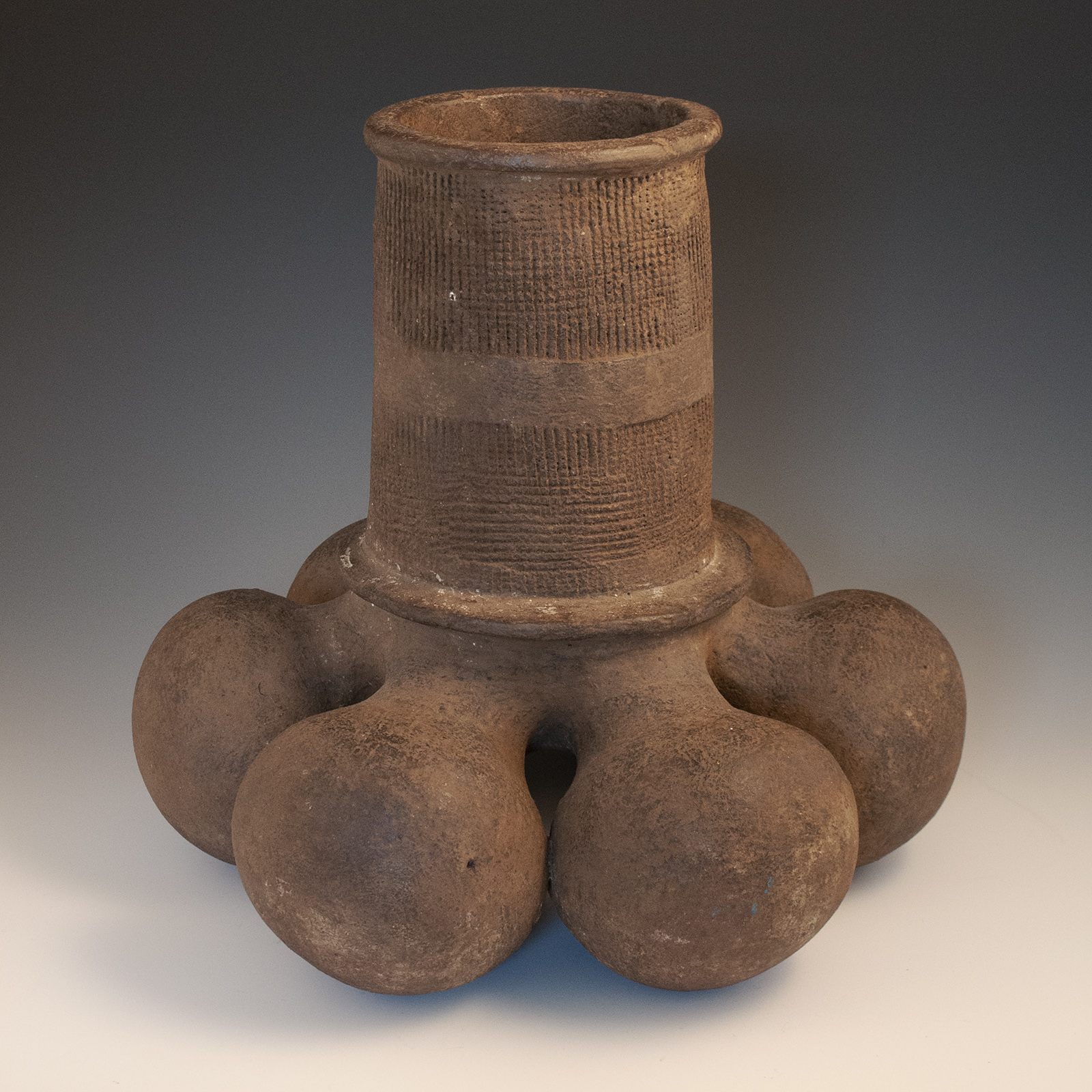 An unusually large non-figurative vessel from the Mangbetu, comprised of six lobes joined to a central vertical cylinder having an impressed crosshatch texture. No repairs or damage, save a few old rim nicks. Ex. private collection, Northern California.