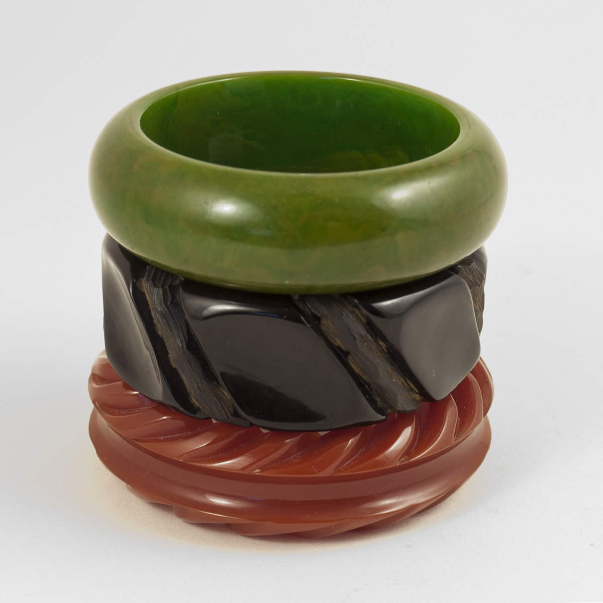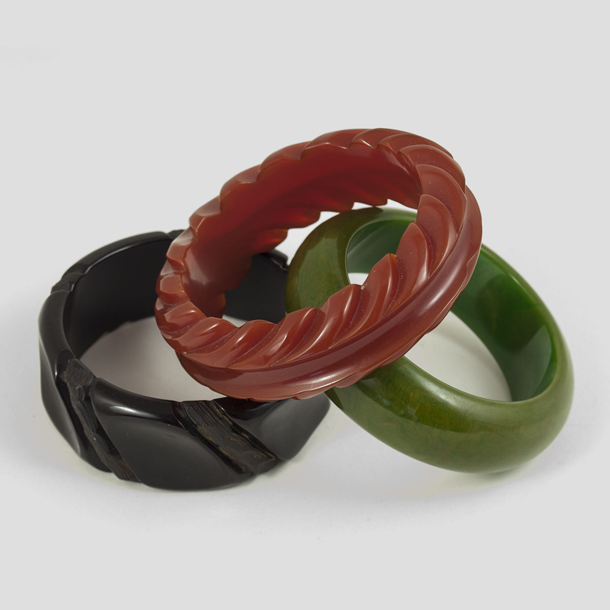 Mottled olive green, hand-carved black and fluted root beer colored bangles in excellent condition. From a large private collection; please enquire about others. All are 2.5 inches in diameter.