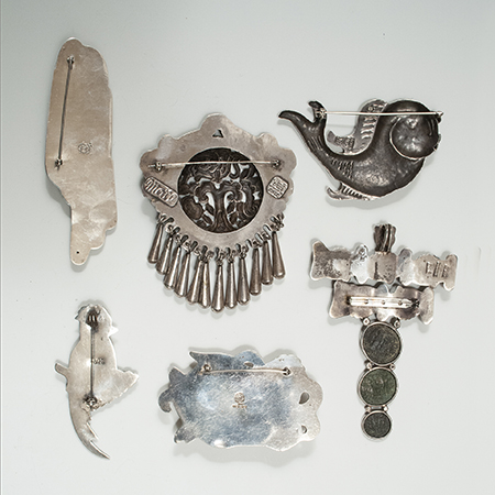 Top center: Silver brooch by MATL designed by Matilde Poulat. 4-1/8 by 3-3/8 inches. 52 grams. $450