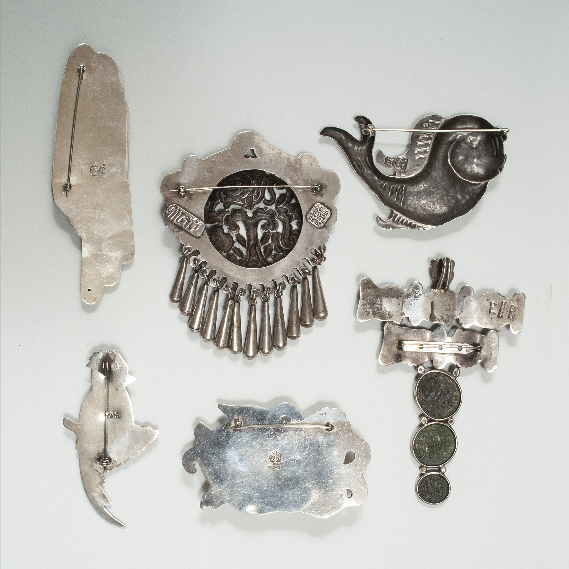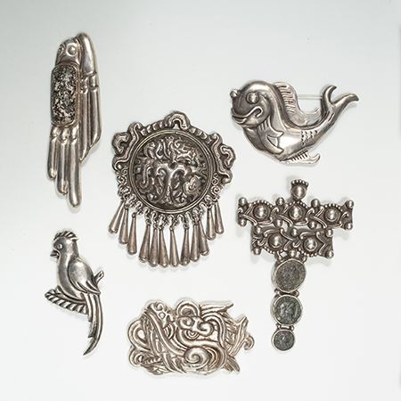Top left: Silver and stone bird brooch designed by William Spratling, but made as a re-issue by a skilled silversmith in Taxco. Marked 923 with the William Spratling logo and TS-24, indicating Taxco and the number of the jeweler, verso. 4.5 by 1-3/8 inches. 46 grams. $500