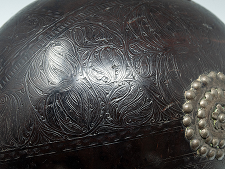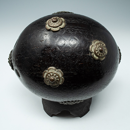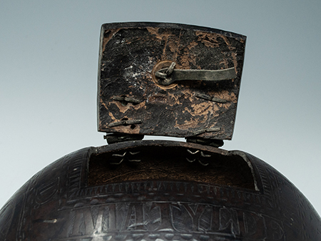 A large carved coconut bugbear in the form of a box with a metal hinged lid. Carved around the lid are the words SOI D. MATYLDE BRENES, which is a Spanish name found in Mexico and Costa Rica. The carved base appears to be newer and doesn’t really support the coconut in a level fashion, but the box tilts even more wildly to the right when supported by the three metal rosettes on the bottom. There are two small cracks from one of the rosettes on the bottom – please see photos.