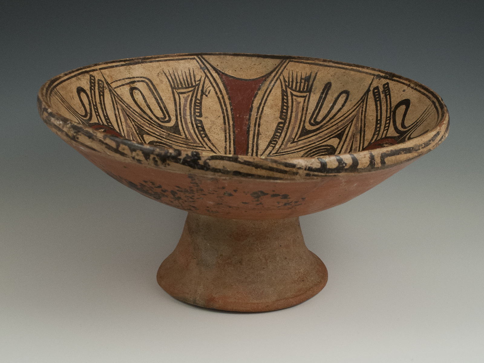 Earthenware dish on a low pedestal foot; the dish face is painted black, red and purple on a cream ground, each half of the bisected design depicting the mirrored image of a stylized bat. Some restoration. Ref: Guardians of the Stream, A.J. Labbe, U. of Washington Press, 1995, #62, pg. 57.