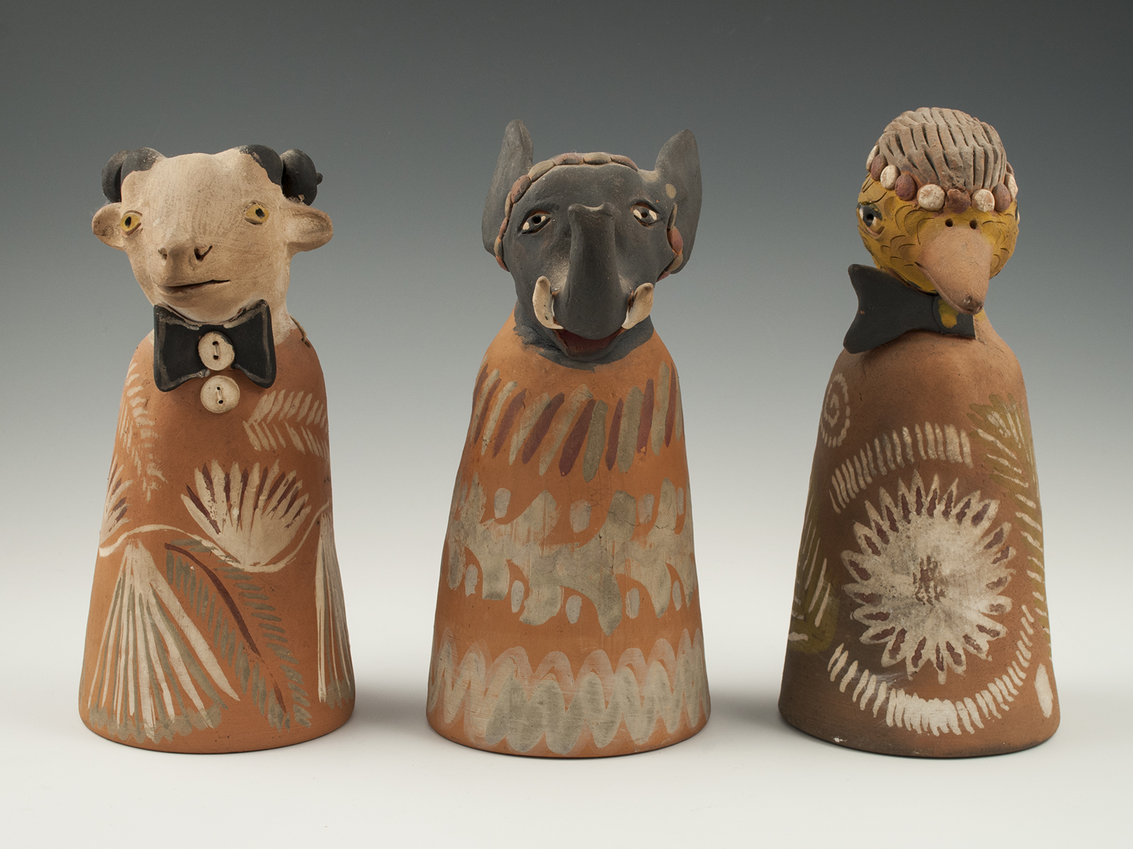 These wonderful ceramic ram, bird and elephant bells were made by the Aguilar family in Oaxaca, most likely Isaura Aguilar, the mother of Josefina, since these were collected in the 1950s. They have a ceramic ball on a string inside for ringing. In excellent condition, except for the right side of the bird's bowtie.