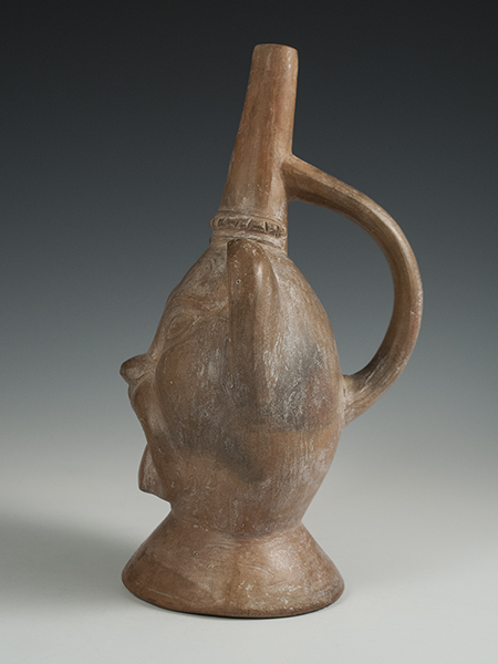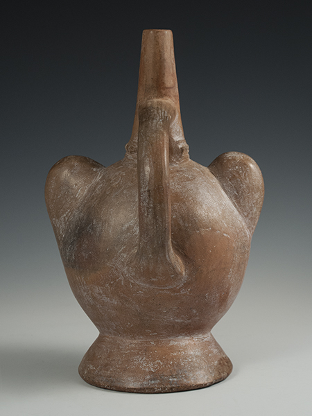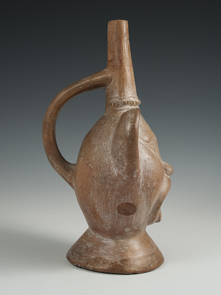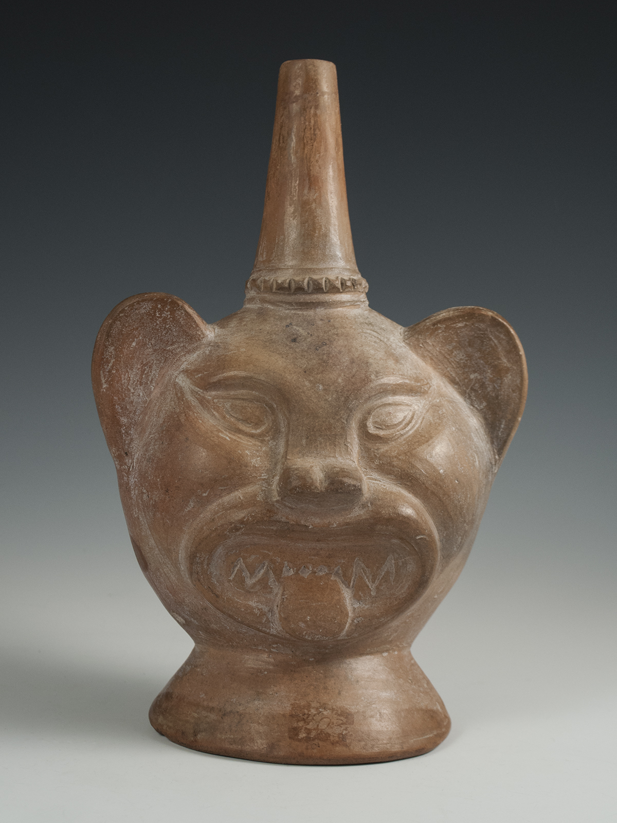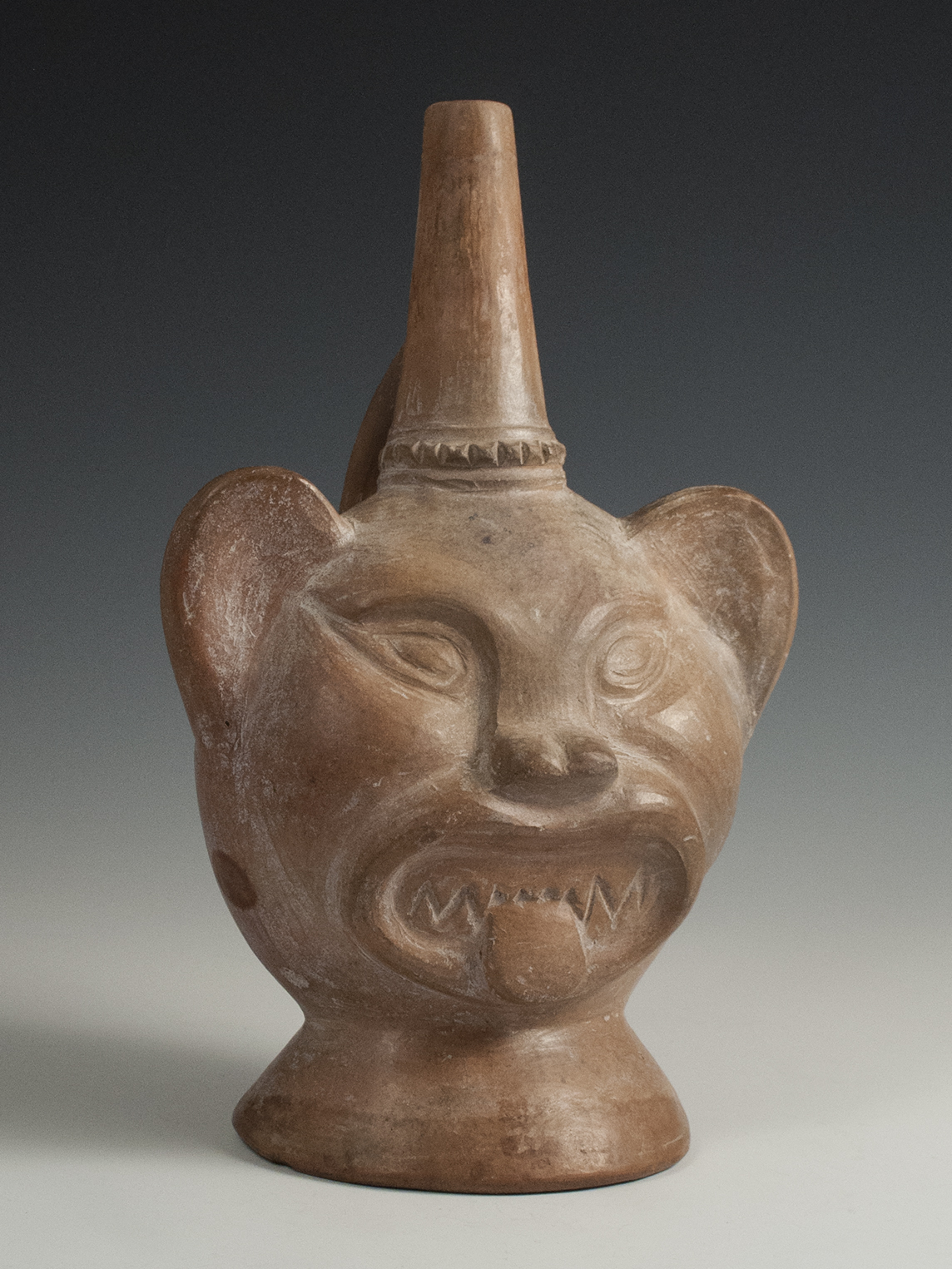 A fierce feline with protruding tongue is carved in relief on this spouted vessel. Ex. private collection, Iowa, ex. David Stuart, Los Angeles, 1992.