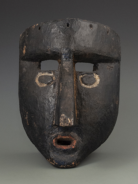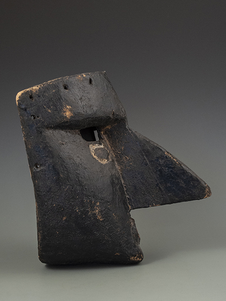 A nice old mask from Guererro, Mexico, used in the Tlacololero Dance of the Tlactapa and probably from the 1950s. The nose has suffered a bit from a fall and has some old touch-up paint. The red painted circular mouth echoes the shape of the white incised circles of the eyes, which are carved just below the holes through which the dancer would peer. The nose appears to have been constructed by adding a triangular piece of wood to the carved nose, but this was done when the piece was created, as this is the typical profile for this character in the dance. Comes with a custom mounting bracket.