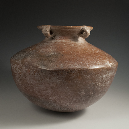 A simple, elegant vessel from Colima with a rounded bottom and four hanging loops on a flared neck. Intact. Ex. private collection, Ohio acquired from Roberto Gray, Patzcuaro, Mexico, 1976