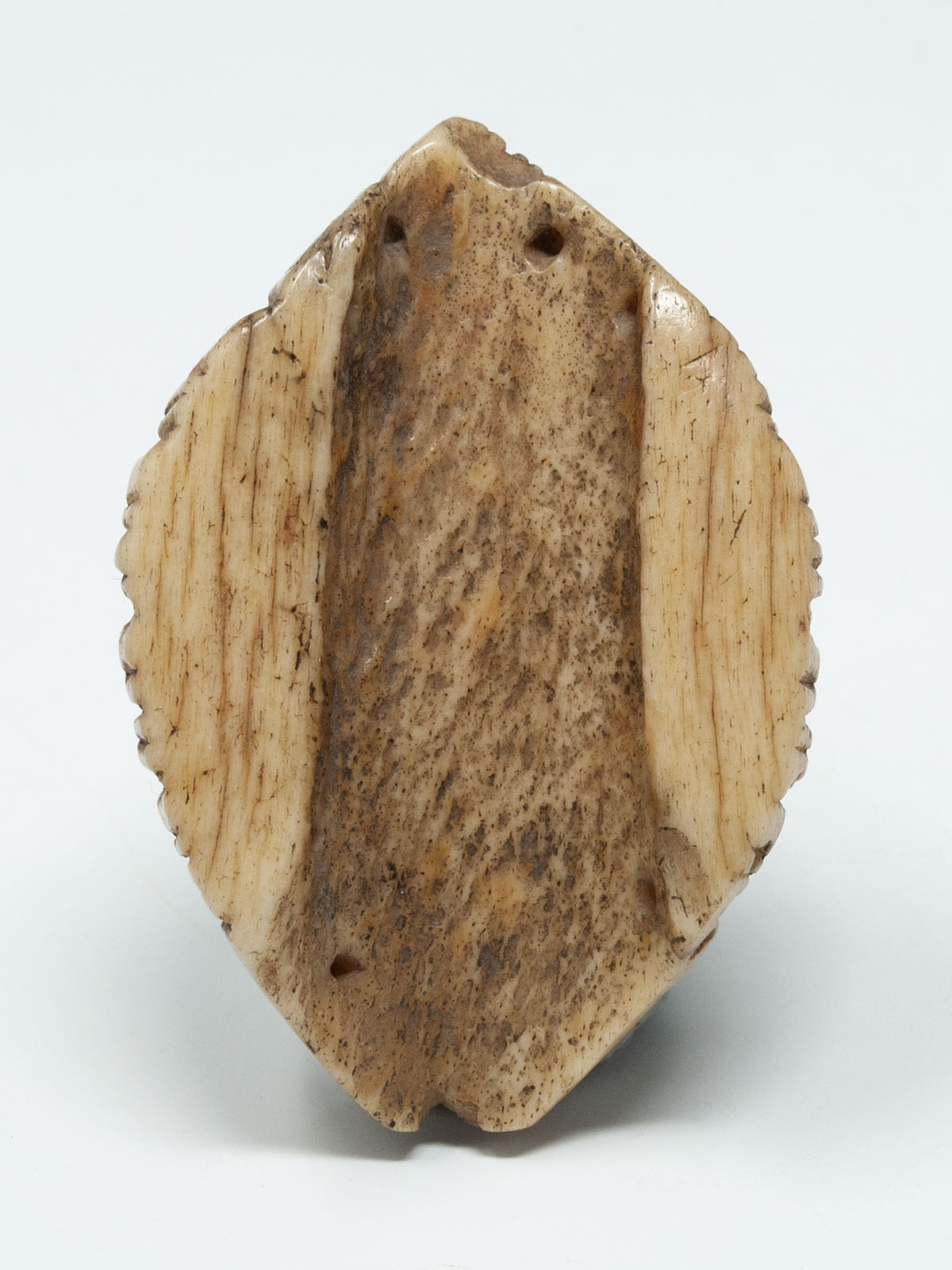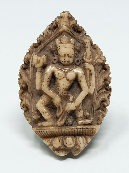Ritual apron plaque, rugya Tibet or Nepal Bone 2-3/8 inches high (6 cm) 18th century or earlier This small diamond-shaped bone plaque is a component of a larger apron worn by Tantric Buddhist priests or practitioners. #2452
