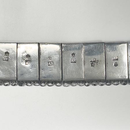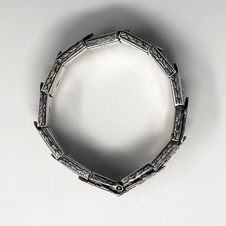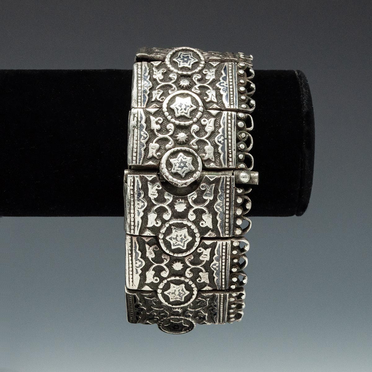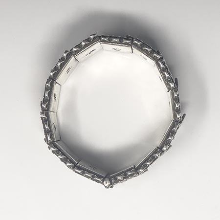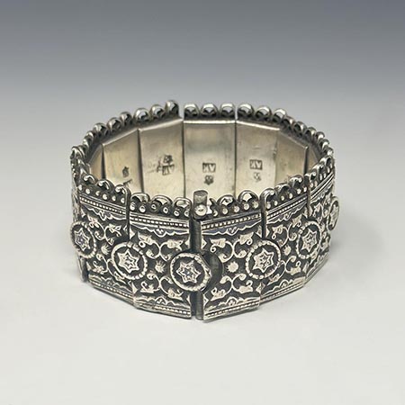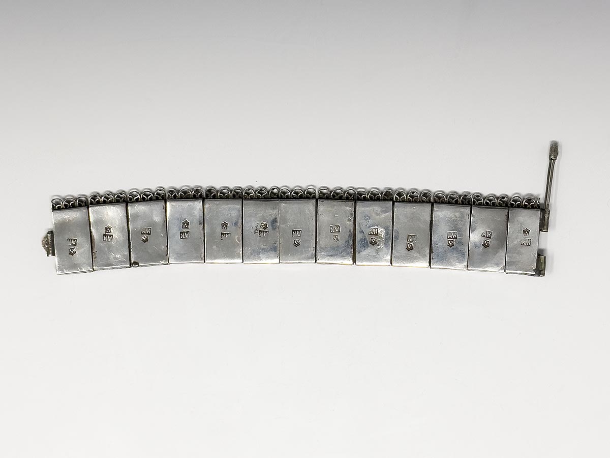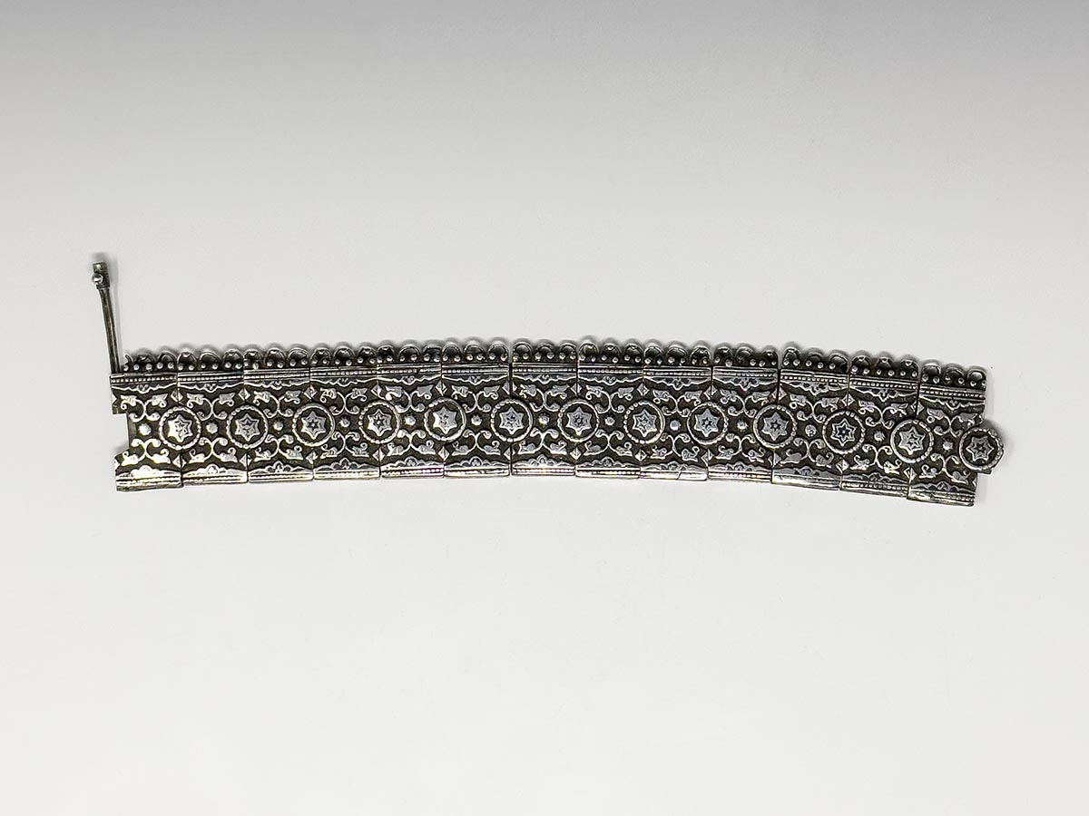 Usually, this segmented design is fashioned into belts, but here it is as a beautiful rare bracelet. The 13 niello and silver interlocking segments are threaded on a band of leather for flexibility; there is a pin closure.