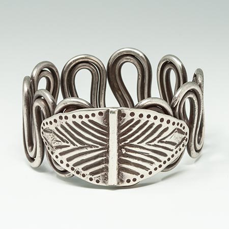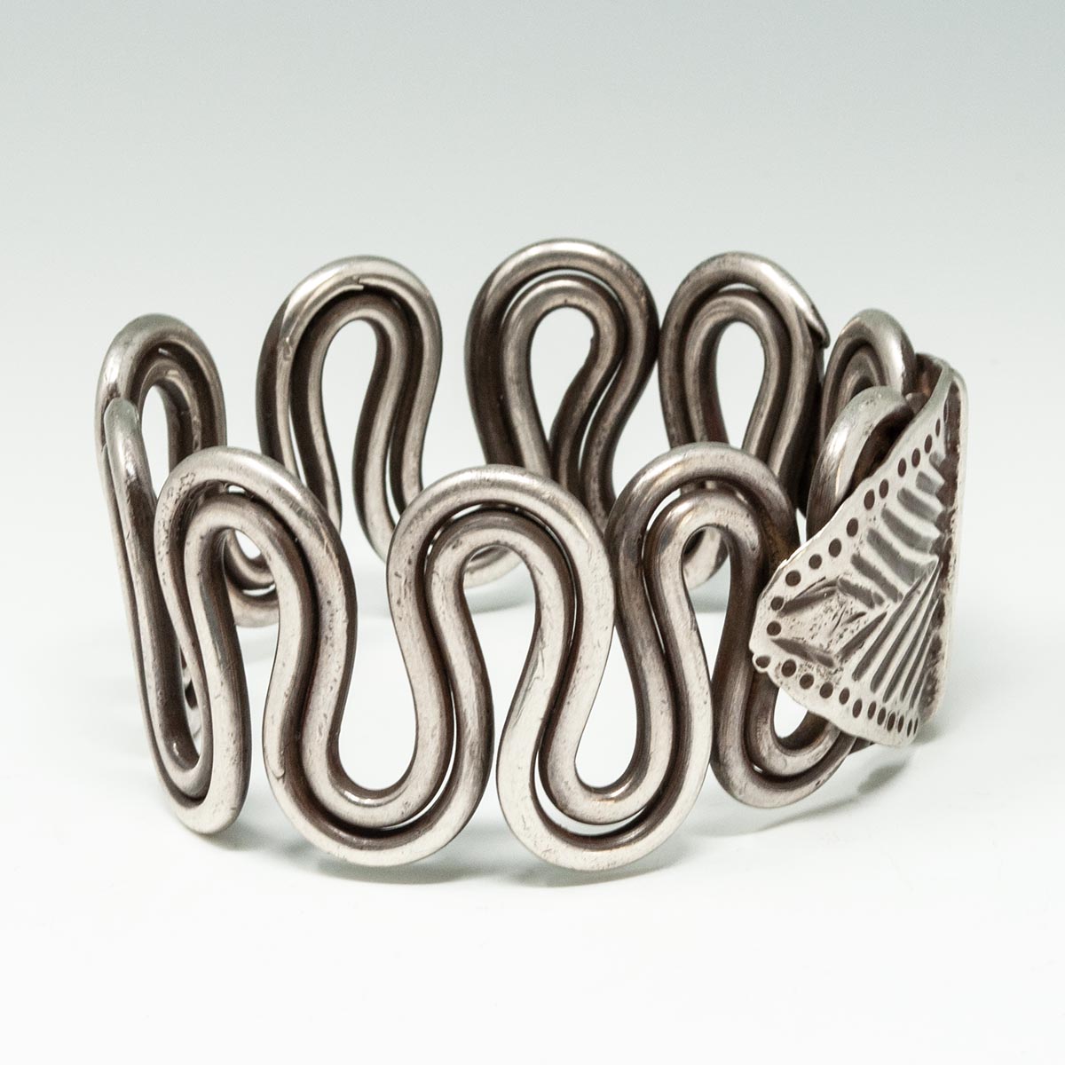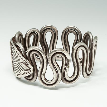 A substantial silver cuff made of wire bent in the shape of a serpent, these bracelets were worn on the upper arm by women in Rajasthan.