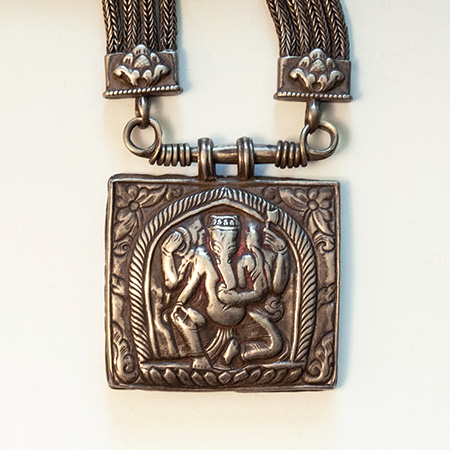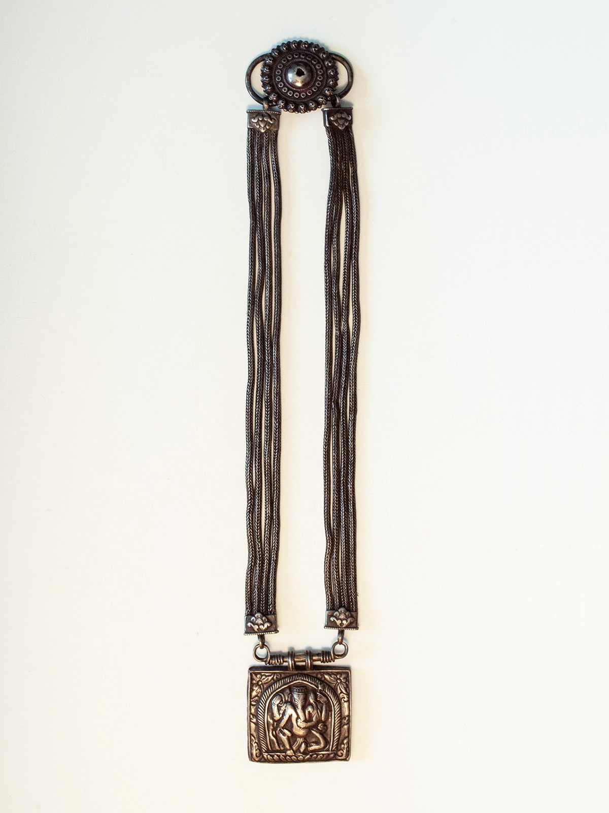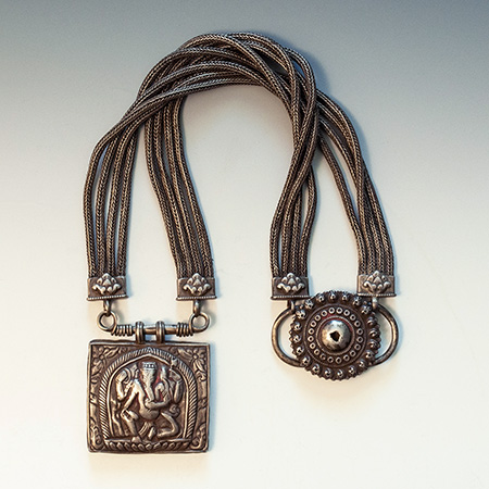 This long silver necklace, jantar, features a hollow amulet box depicting the elephant god Ganesha, which is suspended from eight woven silver wire cords, anchored in the back with a circular lotus repoussé clasp. These necklaces were worn by the wealthy married Tamang women of Nepal; traces of red puja powder remain on the two pendants.