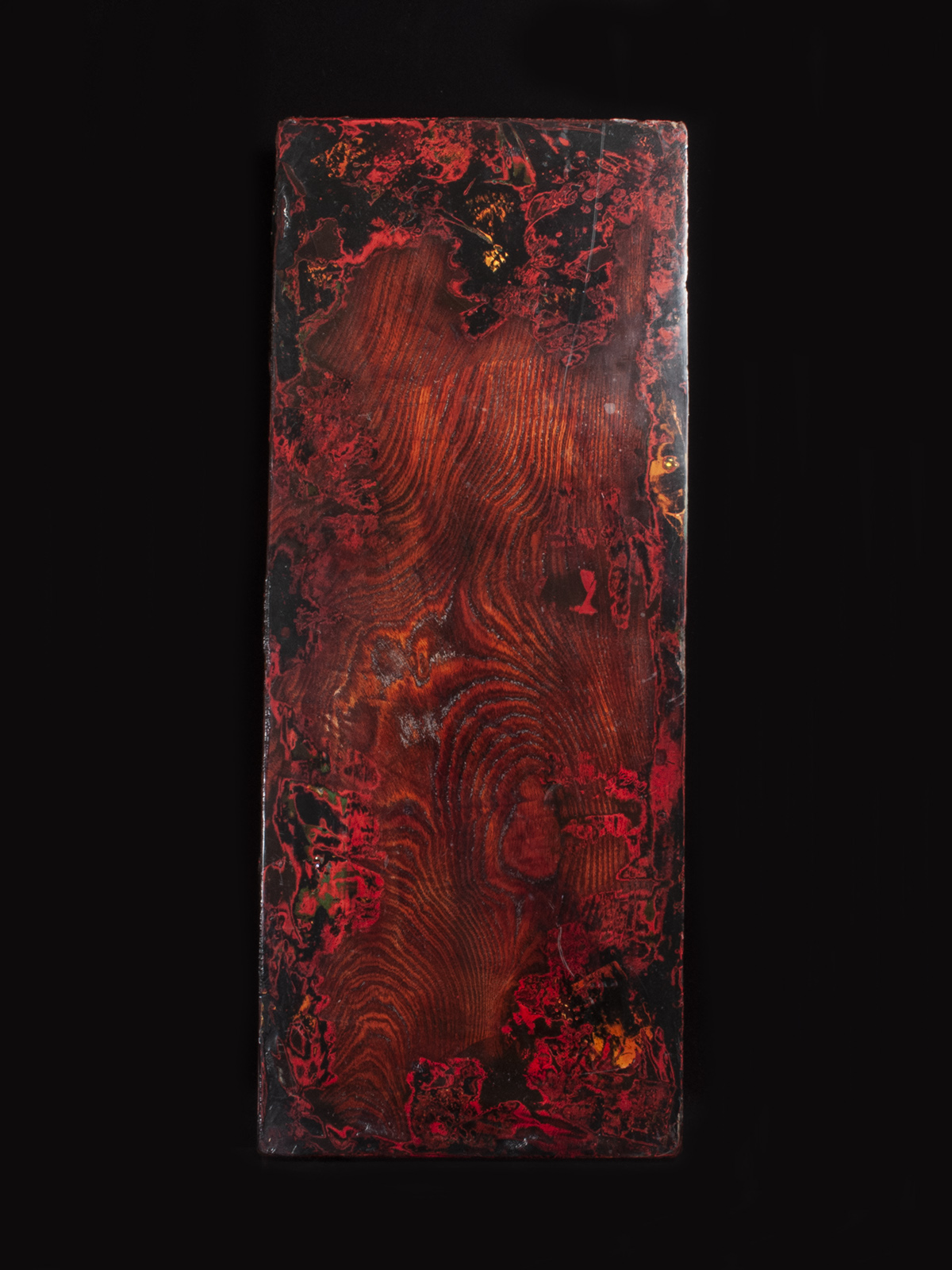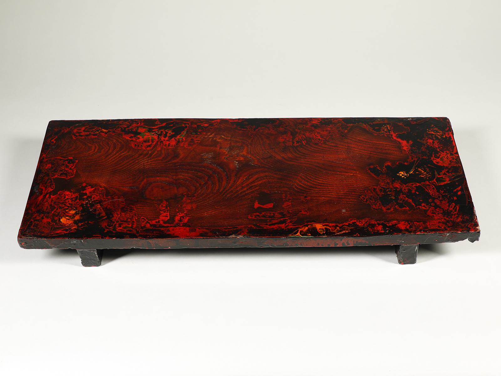 The surface of this low table has been polished down so the gorgeous grain of the wood shows through, then the surface has been varnished. This is a treatment that has been occurring as the lacquer worker's tools, bowls and work surfaces have gained popularity. See the book Layers of Brilliance by Kendall H. Brown for more examples. This table is one inch thick and sits three inches off the ground.