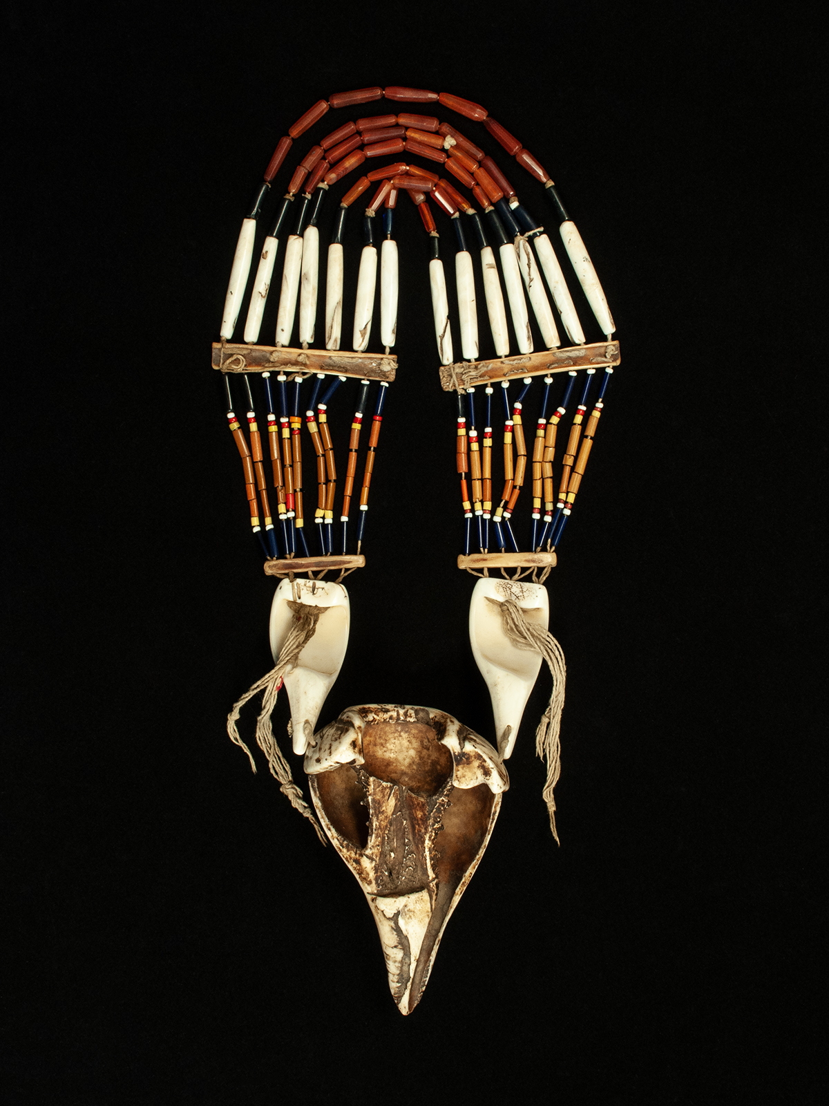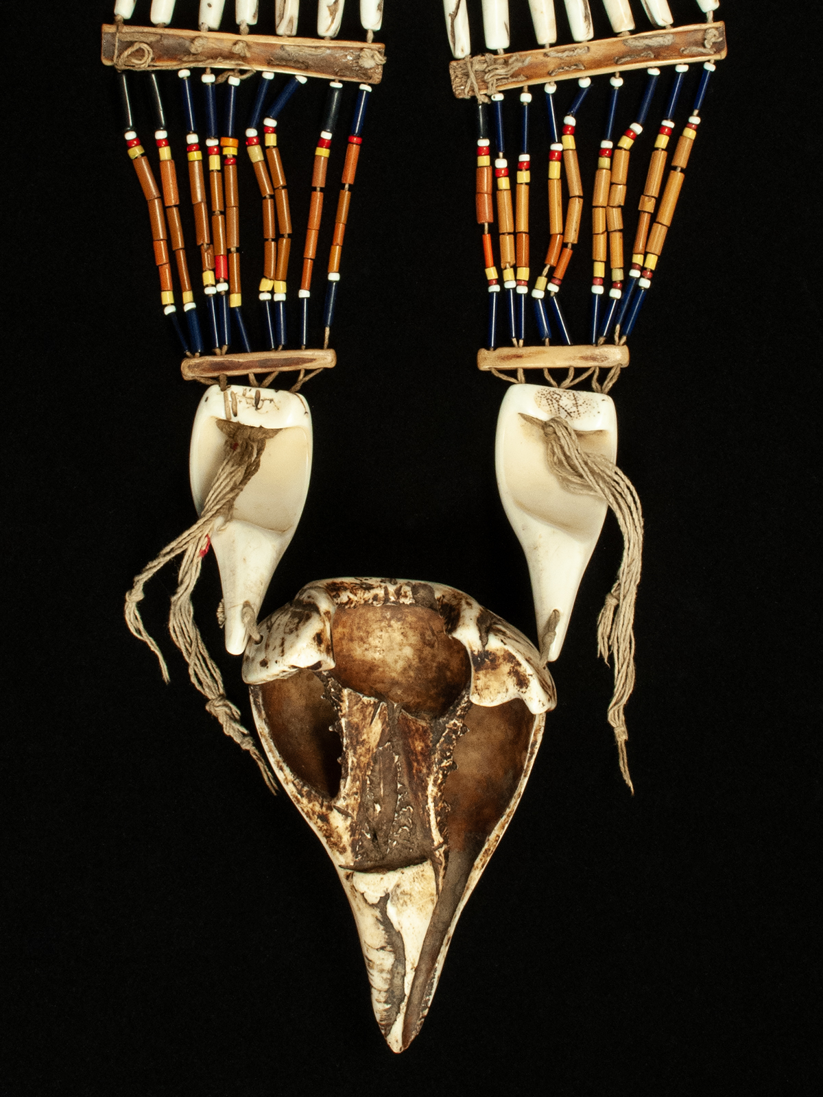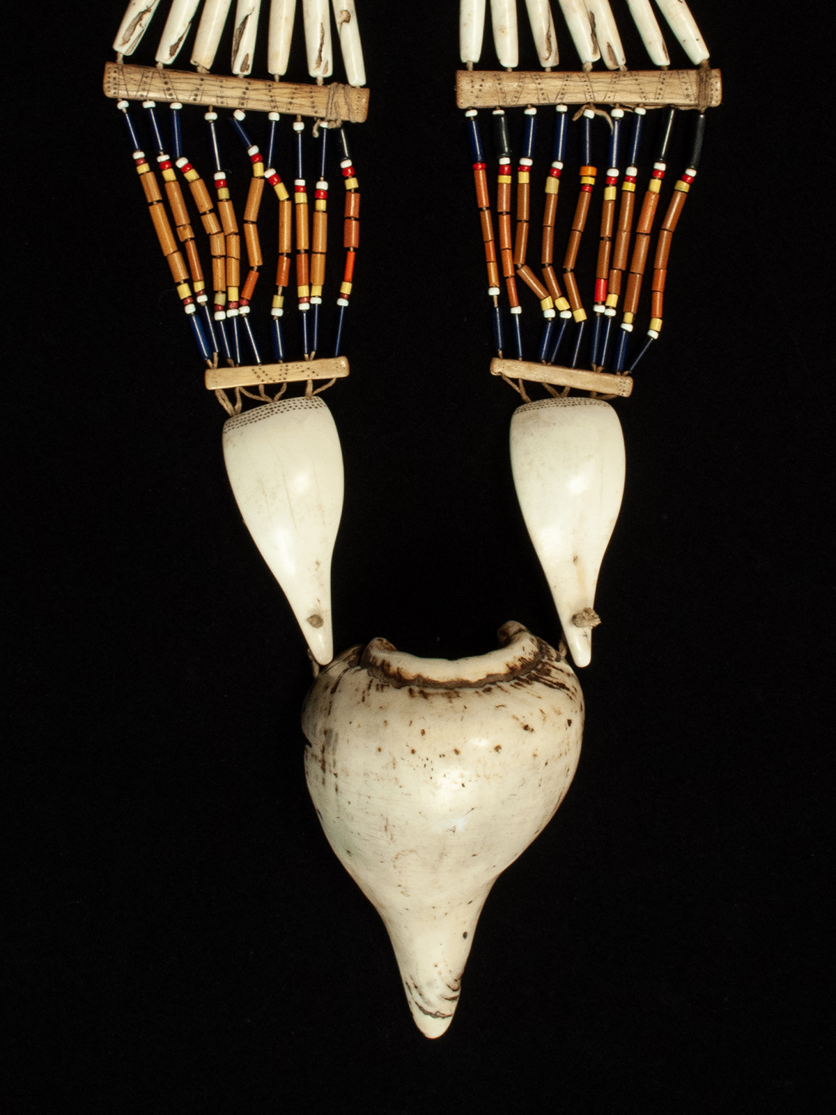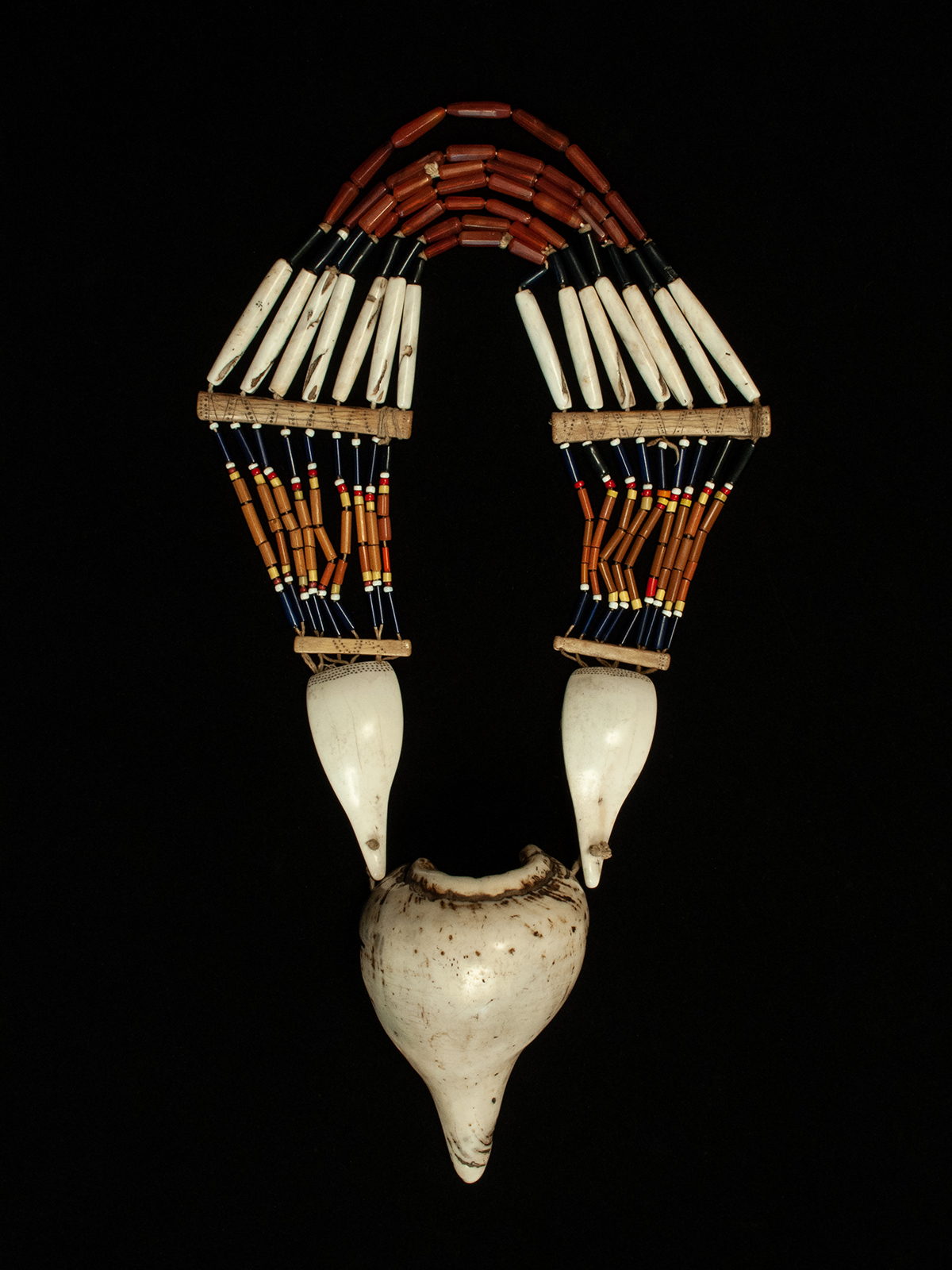 This substantial necklace from the Agami people has seven rows of carnelian, glass and long shell beads that are attached to pecked bone spacers, which anchor nine rows of glass tube beads. The two smooth cut conch shells have four pecked rows at the upper edge. Inner circumference is 27 inches; the large shell is 7 inches in length and the entire necklace weighs nearly 2 pounds. The large shell would be worn at the back of the neck.