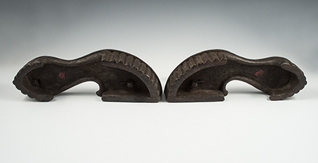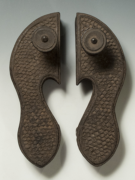 A heavily encrusted pair of Indian paduka sandals with a simple scale pattern. Because leather was prohibited in earlier times, wood was used due to its insulating properties, as it was believed that one's energy would be prevented from being grounded by the earth.