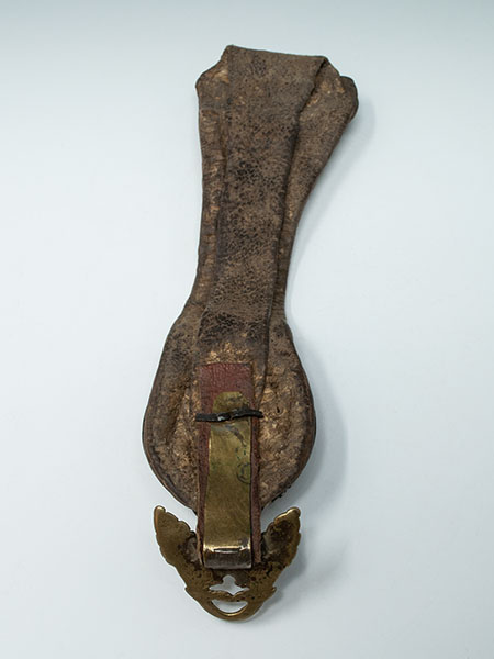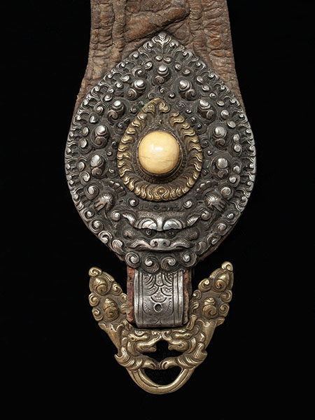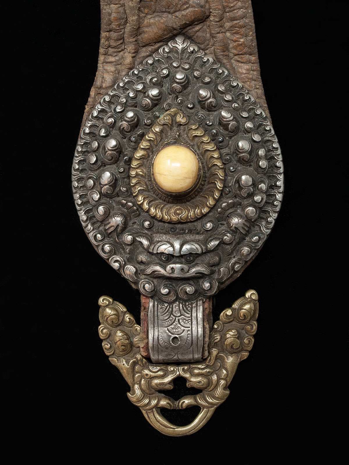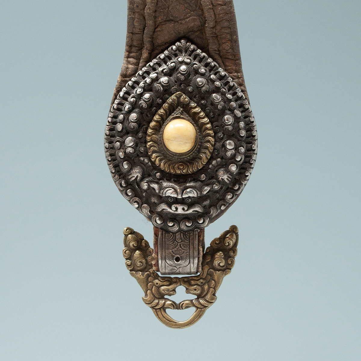A wonderful old Tibetan belt ornament with a repoussé silver and brass medallion surrounding a central bone bead and anchored by a protective Kirtimukha face near the bottom. The brass piece hanging from a silver and leather loop features two dragons facing each other and shows good wear from use. The enire piece including the leather strap measures 11 inches and weighs 120 grams.
