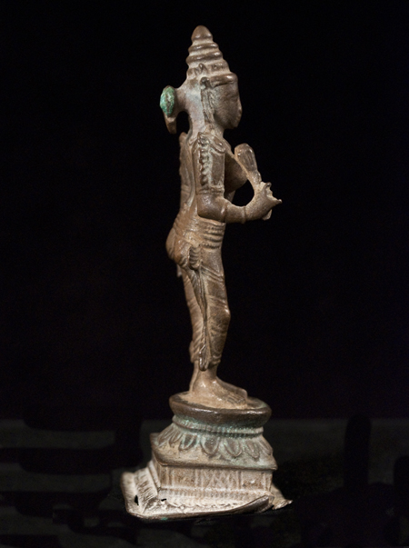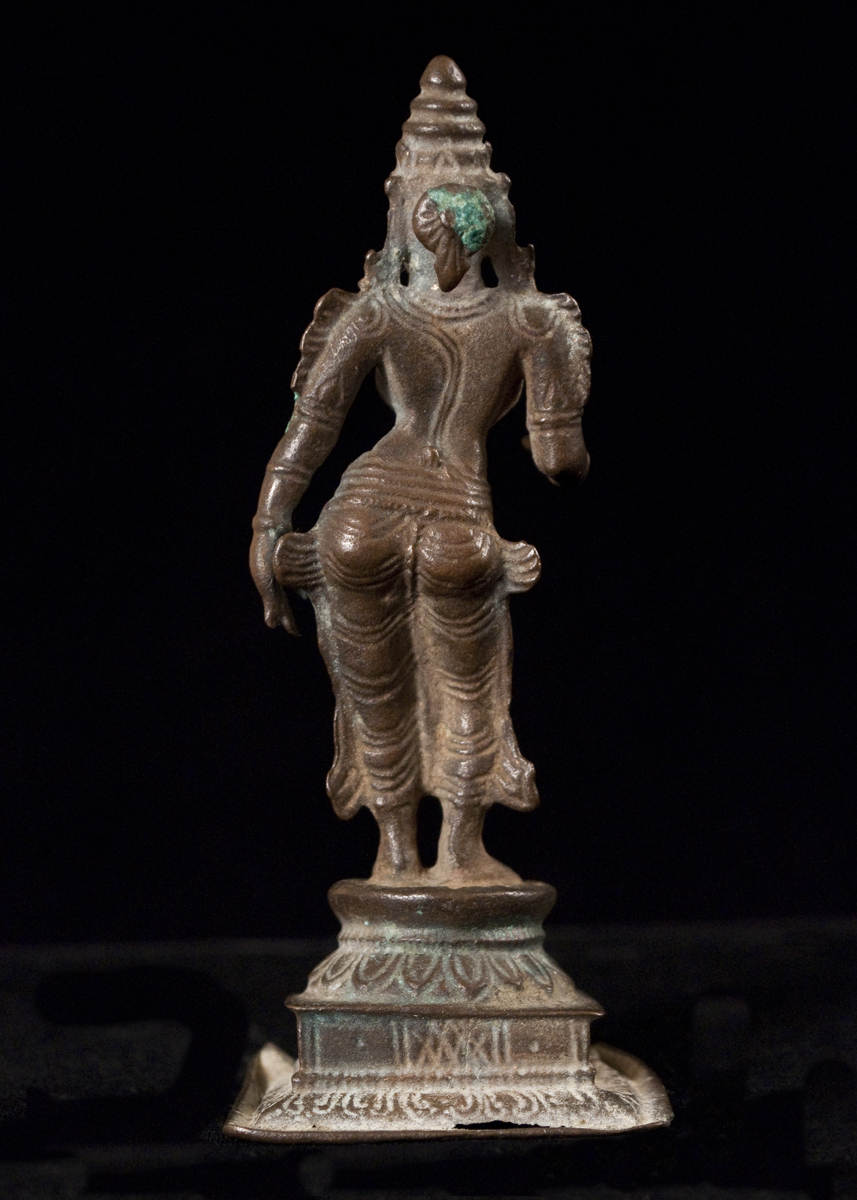 Goddess Parvati is known as "the daughter of the mountain" and is the most powerful goddess in the pantheon. She is Shiva's loyal and loving consort and is the benign aspect of Mother Devi. Here she wears the tall, multi-tiered karandamukuta crown and striped dhoti. With her weight on her left leg, her graceful curves are accentuated by her left arm, which she holds in a gesture known as lolahasta. Her right hand holding a lotus, with her pinky finger delicately extended.
