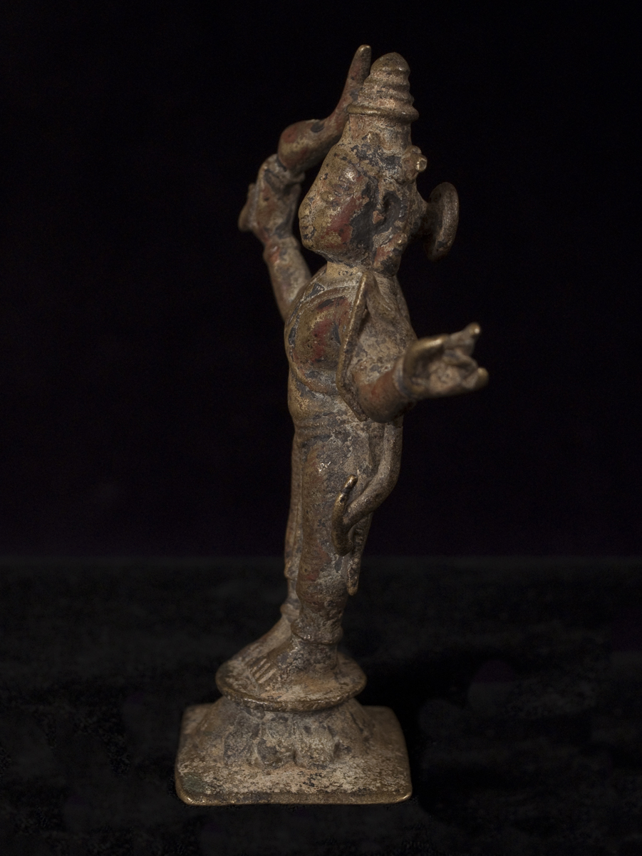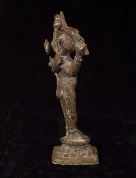Rama is one of the most beloved incarnations of Vishnu. He holds a special place in Indian folklore, as the devoted husband who rescues his wife Sita from the demon Ravanna. As the hero in the Ramayana epic, he represents fidelity, gentleness and steadfastness, the ultimate qualities of manhood. Standing here in samapada pose, with his feet evenly placed, he carries a bow and quiver, and wields a weapon of some sort. A conical crown, a short striped dhoti, and a small hair disc complete his outfit.