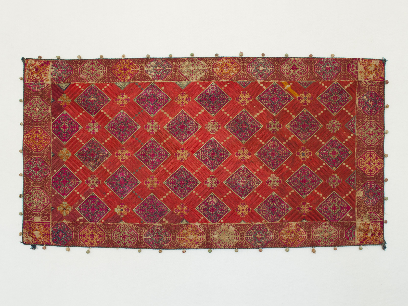 Embroidered cushion cover Swat Valley, Pakistan Cotton, silk 16.5" (42 cm) high by 31.5" (80 cm) wide Early 20th century This finely hand-embroidered cushion cover shows some thread loss, especially in the border areas. #9463 $275