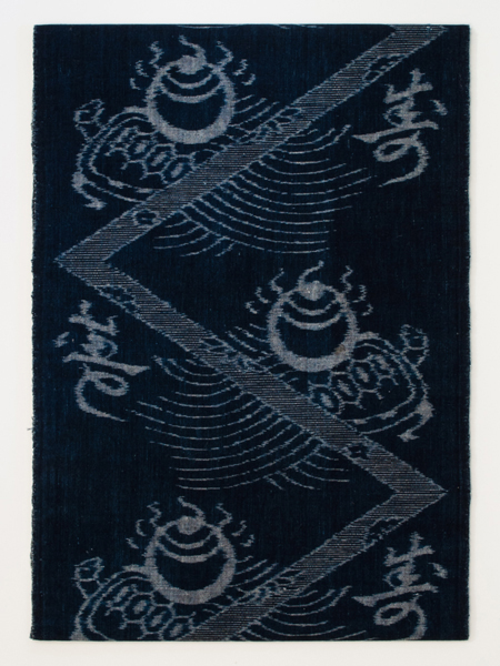 The design motif for this kasuri ikat is a turtle and a mythical jewel. The condition of this piece is excellent, with one small area of broken threads, barely visible. Below is a photo taken with my phone of the entire piece; it is not at all faded, but the light from the window makes it appear uneven at the bottom.