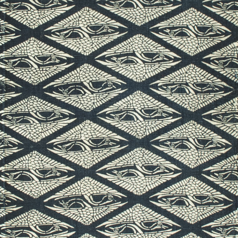 Two cranes with wings spread neatly fill diamond-shaped lozenges in this cotton stencil-dyed indigo katazome strip. Katazome refers to the resist dye technique using rice paste and bran squeezed through a stencil (katagami) to produce beautiful repeat patterns.