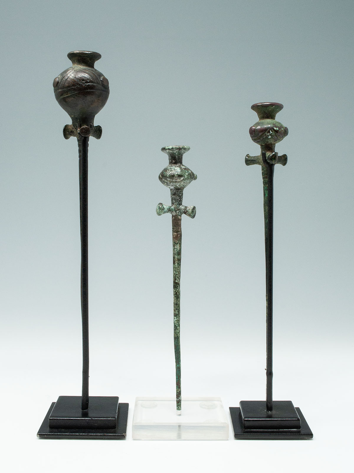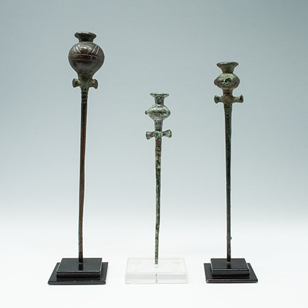 Three copper alloy lost wax cast cloak pins in the form of an opium poppy on custom bases.