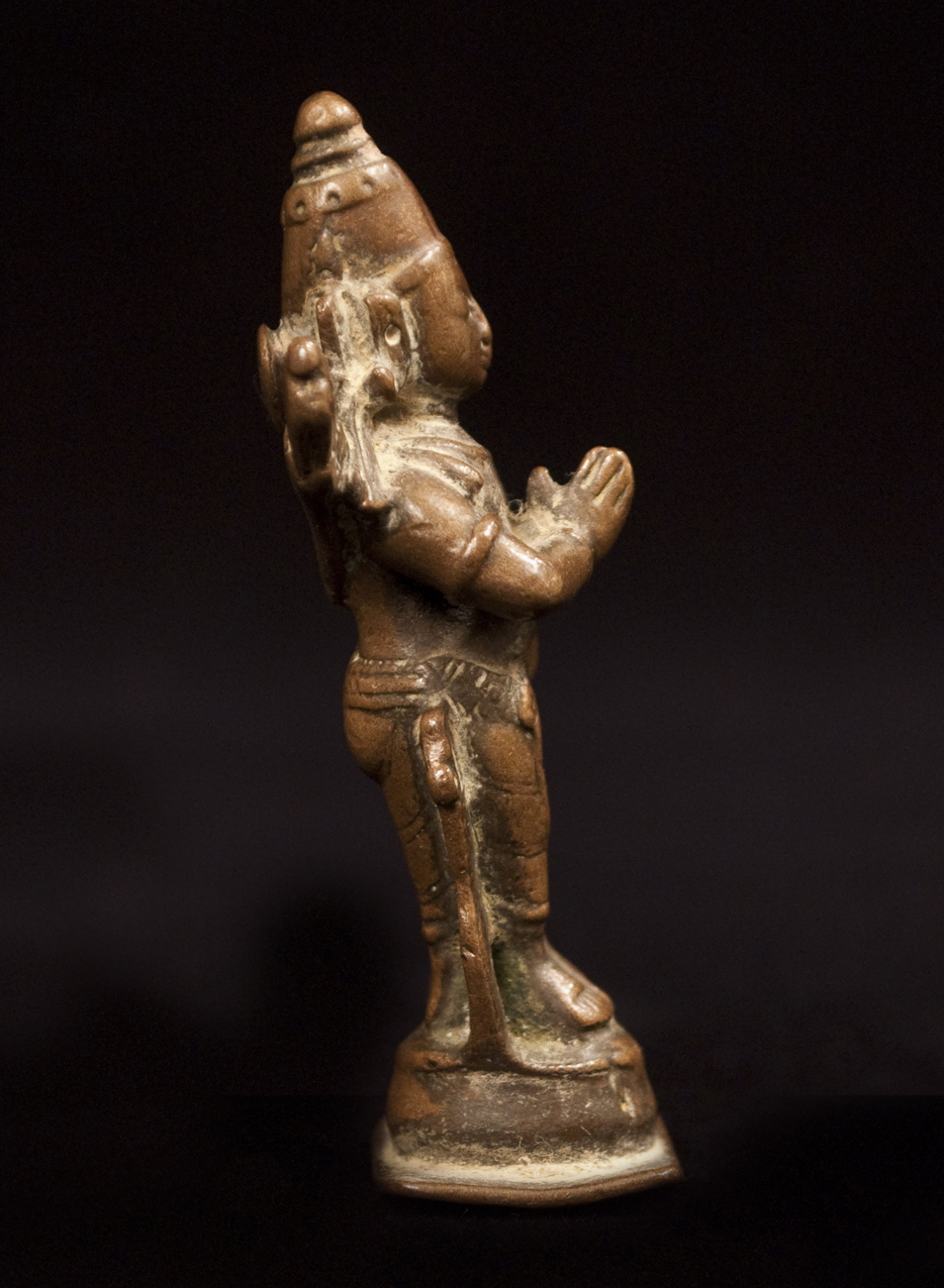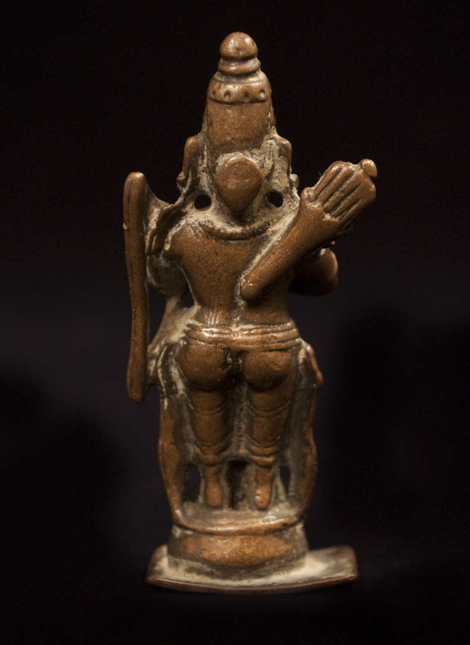 Rama is one of the most beloved incarnations of Vishnu. He holds a special place in Indian folklore, as the devoted husband who rescues his wife Sita from the demon Ravanna. As the hero in the Ramayana epic, he represents fidelity, gentleness and steadfastness, the ultimate qualities of manhood. Standing here in samapada pose, with his feet evenly placed, he carries his quiver on his back, his bow in the crook of his arm and holds both hands in apana mudra. A conical crown, a dhoti, and a small hair disc complete his outfit.