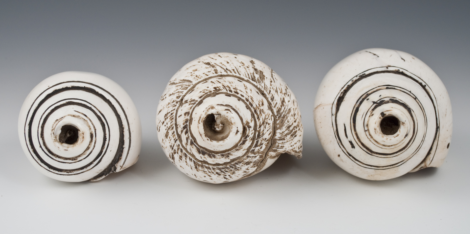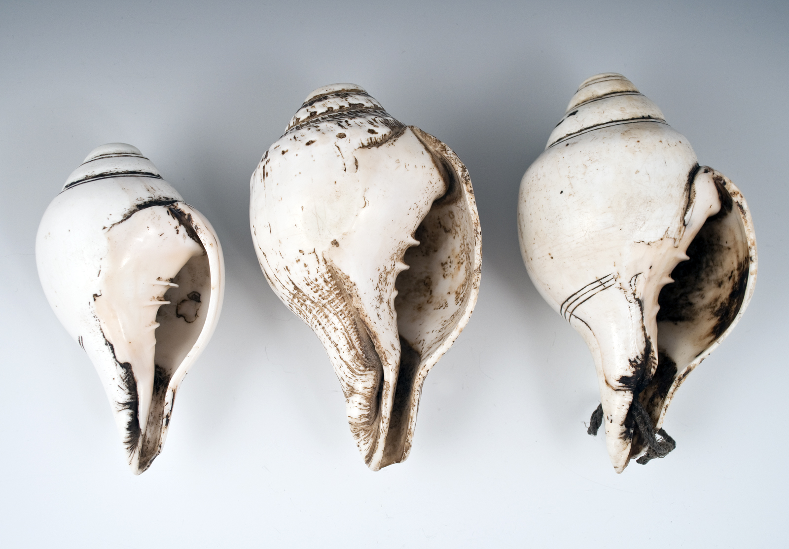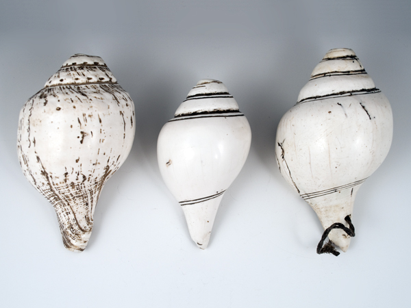 Shell trumpets Himalayas Conch shell 19th century Sold separately Left: #2854 7" (17.2 cm) long $900 Center: #2855 6" (15.2 cm) long $775 Right: #2853 7.5" (19 cm) long SOLD