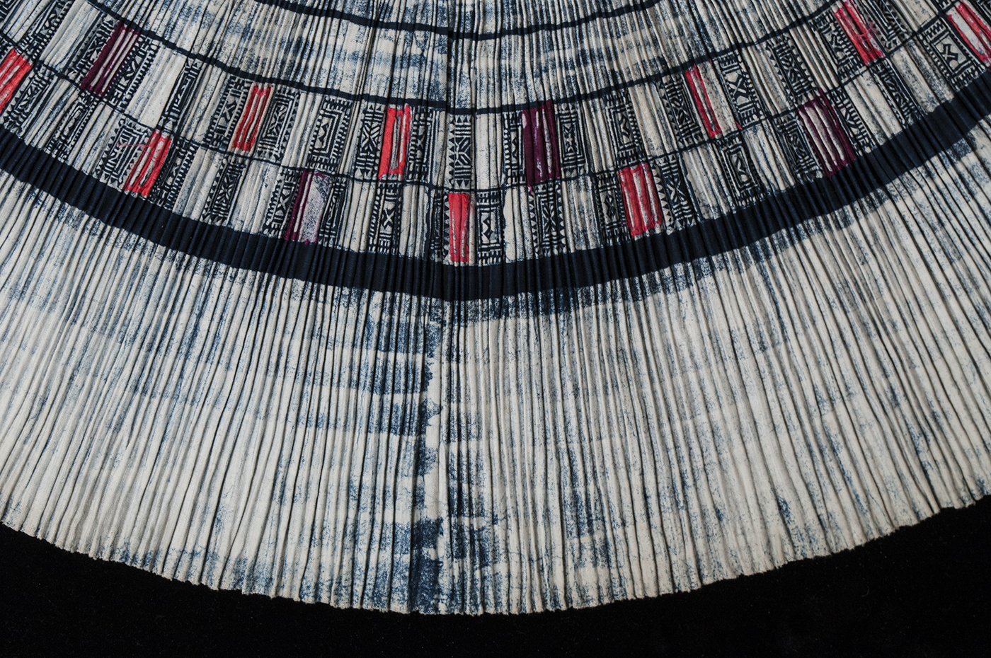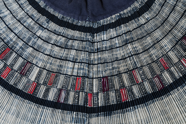 Skirt is open at the side, with the pleats joined to a wide cotton waistband. The designs are wax-resist in indigo and there are small squares of colored silk appliqued on two center bands, most of which are frayed from use.