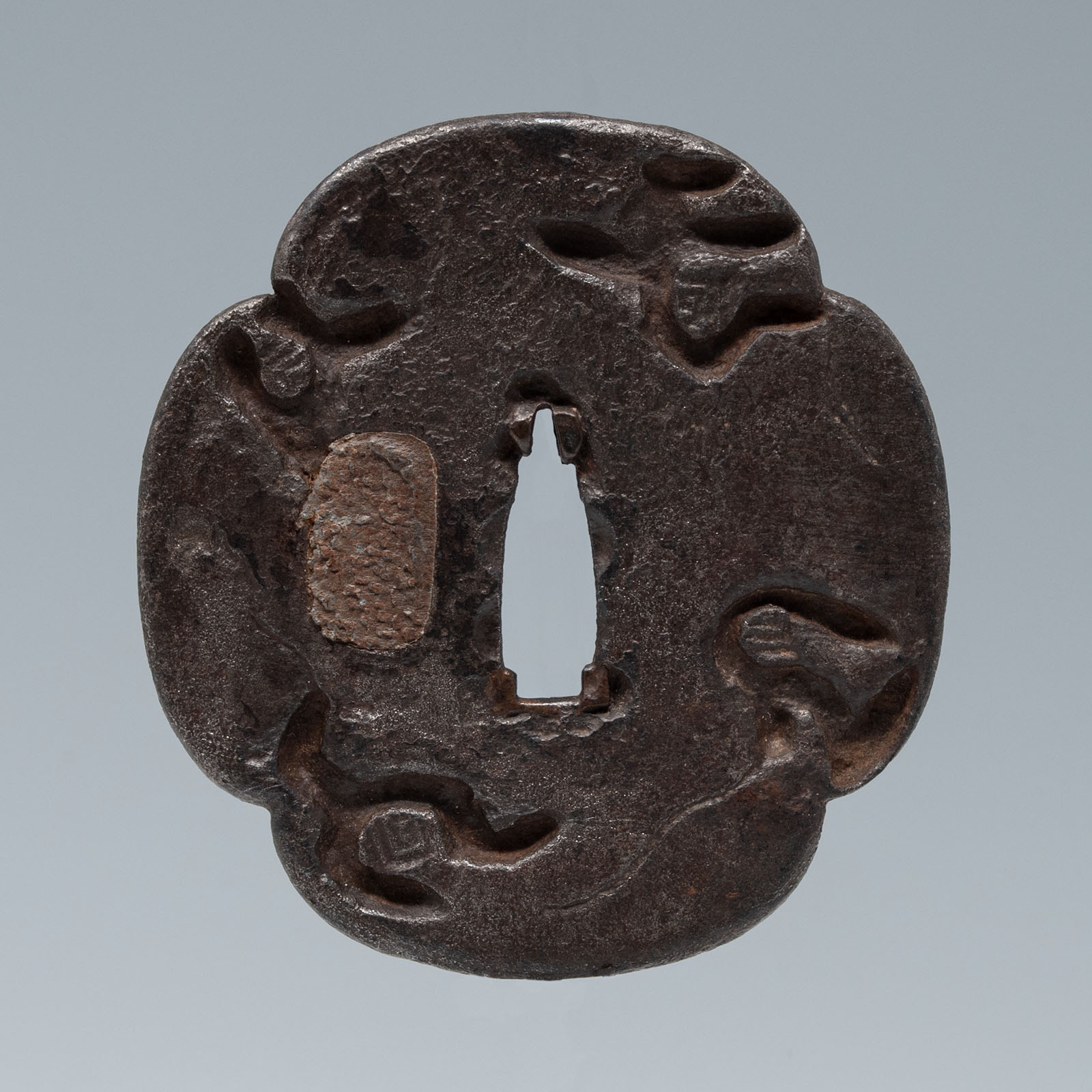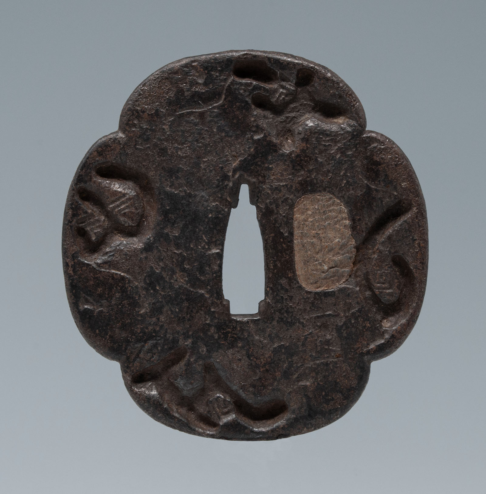 Tsuba sword guard, Saotome (armour school), Japan Iron alloy, lead plug 3 inches (7.7 cm) high by 2-7/8 inches (7.3 cm) wide Circa 1600 #2834