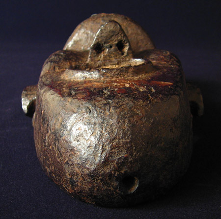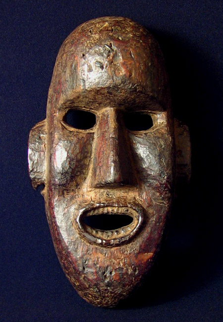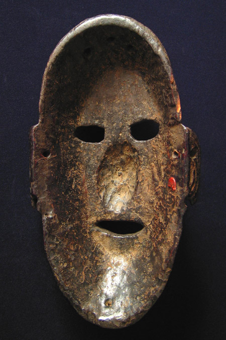 A wood mask from the Middle Hills, Nepal. It measures 6" wide by 11" high and does have a little red in the wood, but it is really a chocolate brown. The earlobes have holes that are worn through and there are three holes in the top of the head. A few metal fragments are embedded in the forehead - see close-up below. Mid-19th century. Ex Mort Golub. Please see detail photos below. #2033 SOLD |