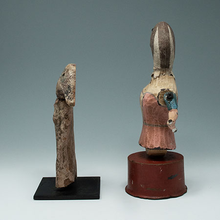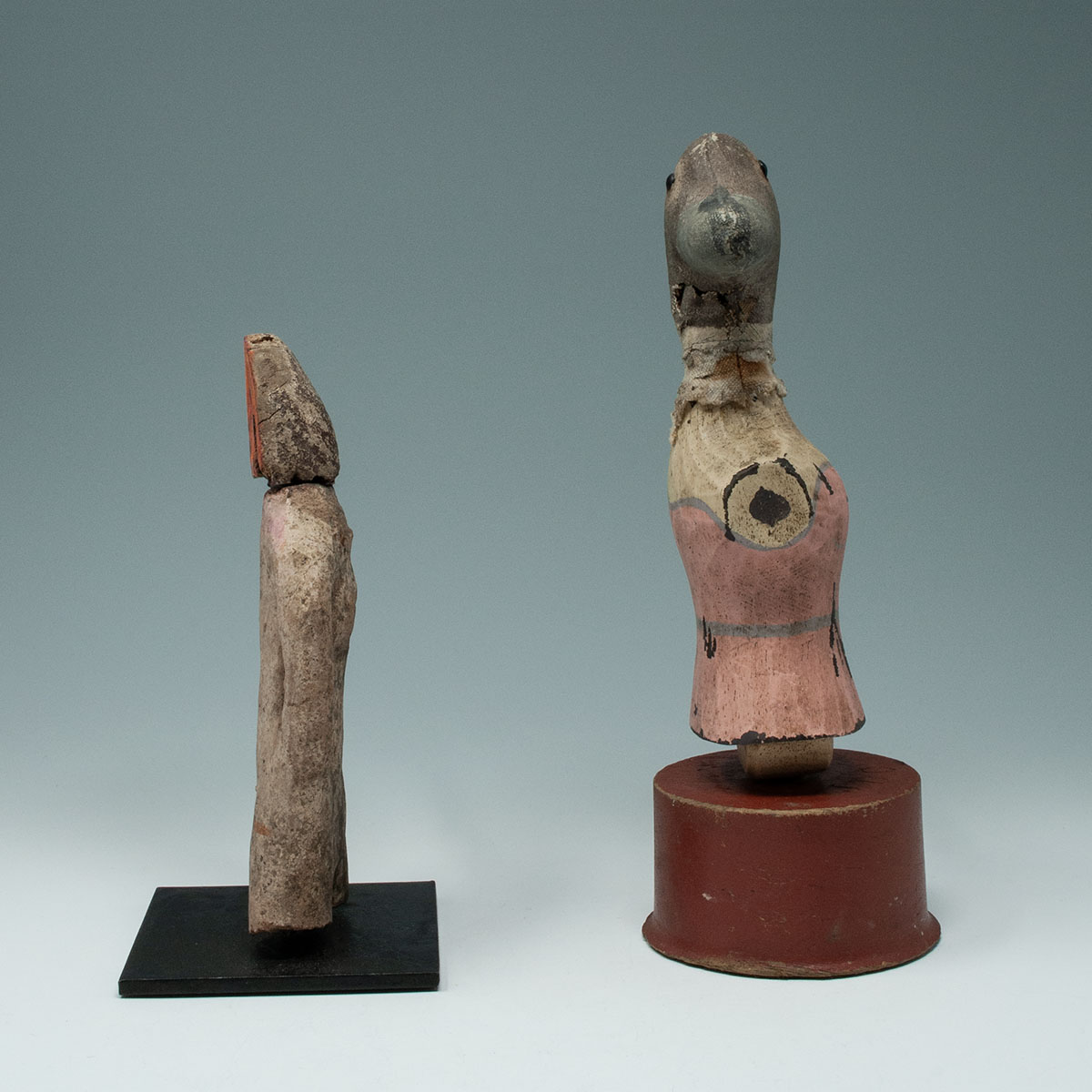 Two irresistible, quirky duck figures from the studio of Mort Golub. The first posesses the torso of a Pre-Columbian terracotta figure, which has been joined to the weathered head of an old duck decoy. His consort wears a pink dress from an old doll, a fragment of one arm from some other abandoned creature and the haughty head of decapitated decoy.