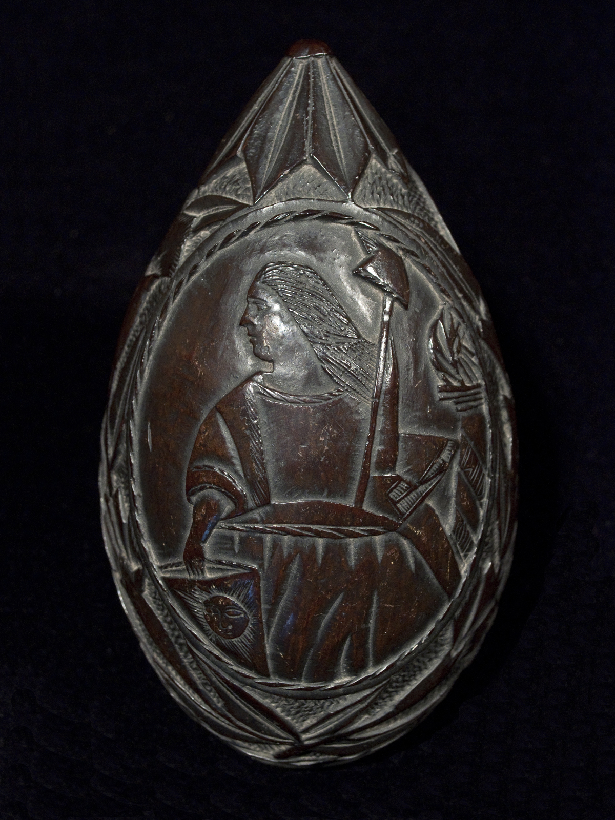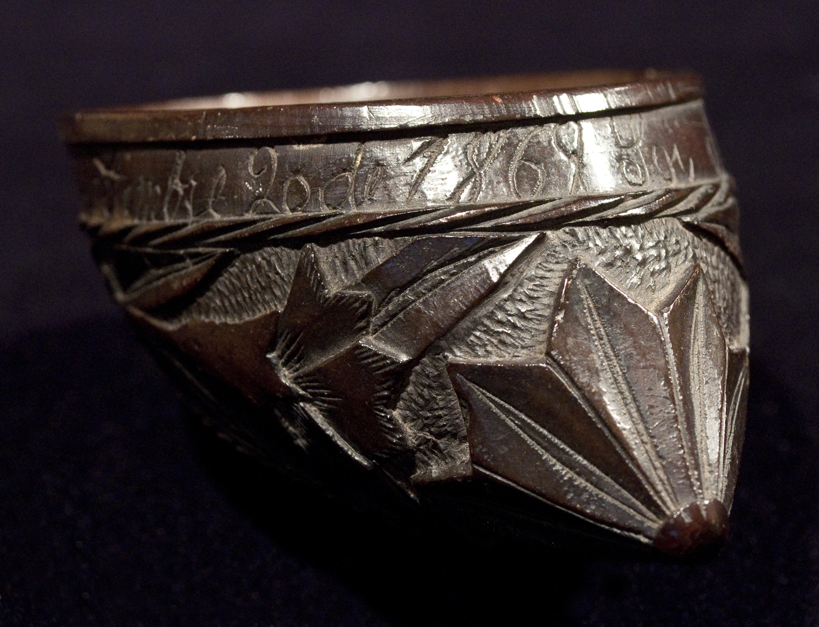 A carved coconut cup from Central America with the date 1869 in a band of script around the cut edge that says "Yoi (loi?) del uso del senor Nicolas Gomes Setiembre 20 de 1869". Made by a sailor, a traveler or perhaps a prisoner, this one has a nice patina from handling and age. There is one small crack on the rim which can been seen on the right in the bottom photo.