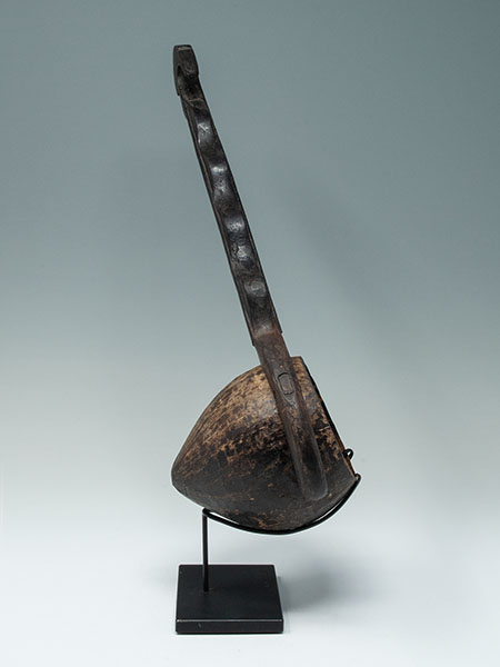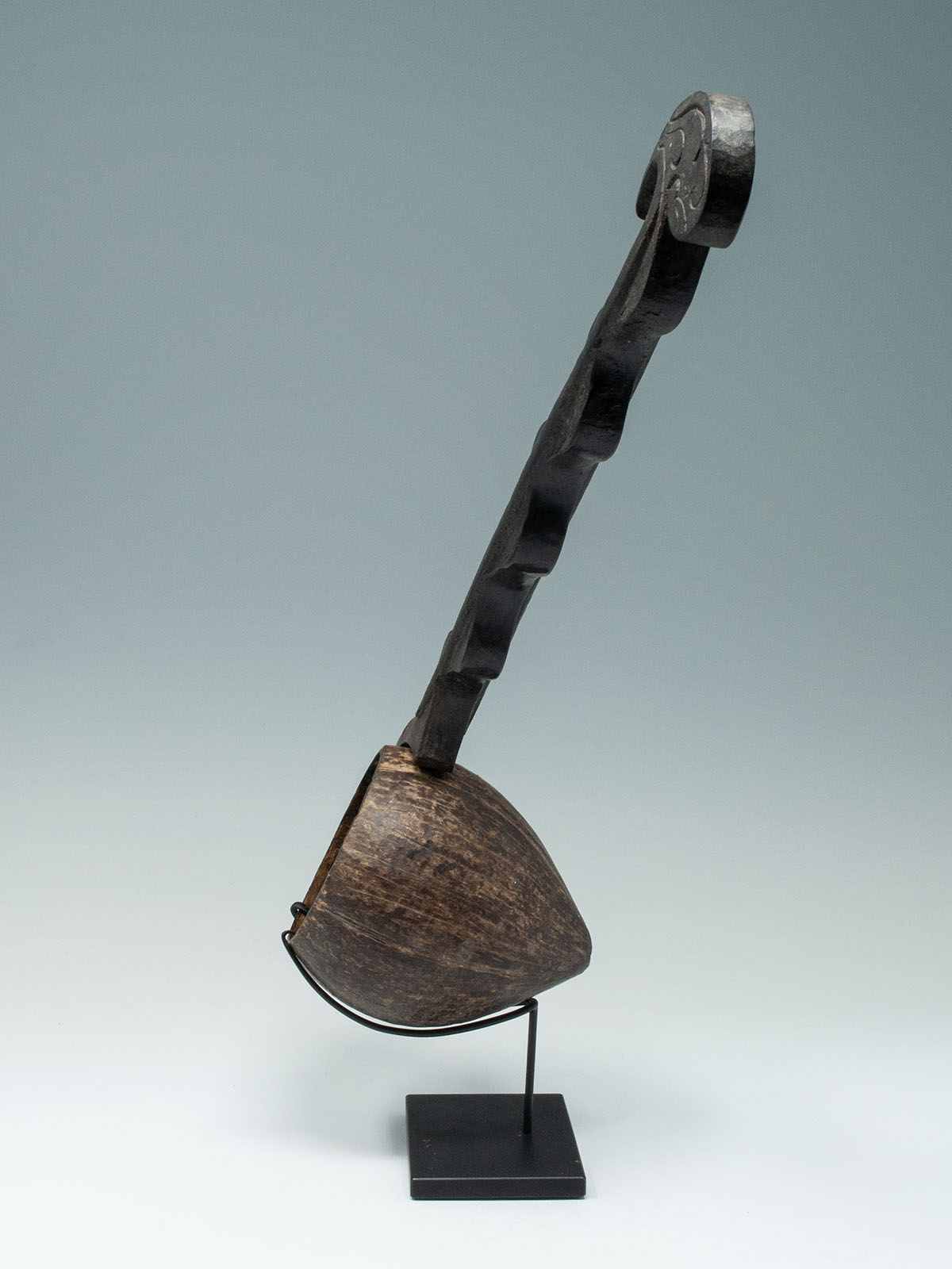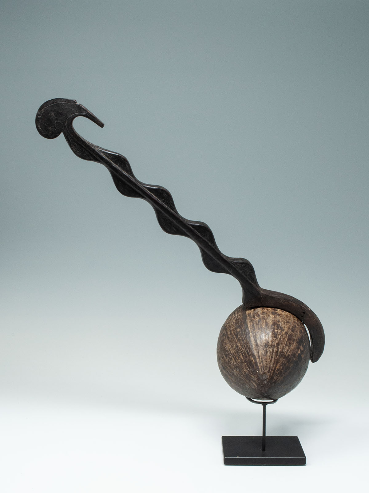This is a rare coconut shell holy water dipper from the Bali Aga people of the Kintamani region of Bali, Indonesia. Used to scoop Air Succi holy water by these Hindu-animist mountain people of the Lake Batur area, the undulating carved wood handle has various symbolic meanings. The bird head is that of an Ayam Hutang jungle cockrel, which represents virility and strength. The wavy aspect represents water and the serpent, both associated with abundance and prosperity. The handle has a finely encrusted patina.