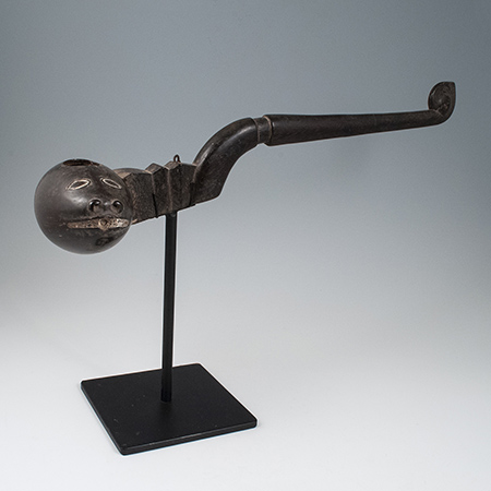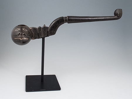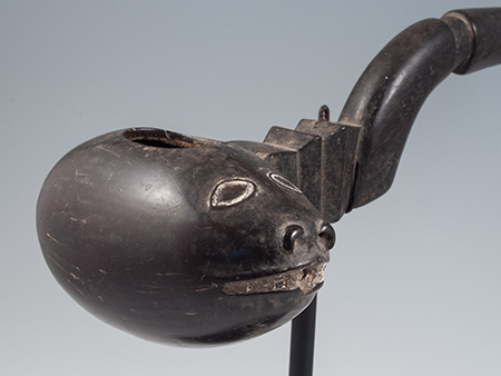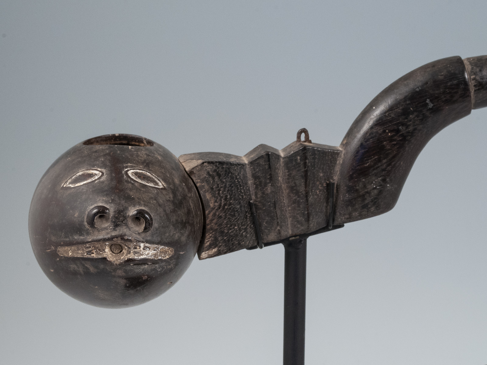 An elegantly carved wooden handle holds a zoomorphic coconut bowl, with incised eyes and mouth infilled with lime.