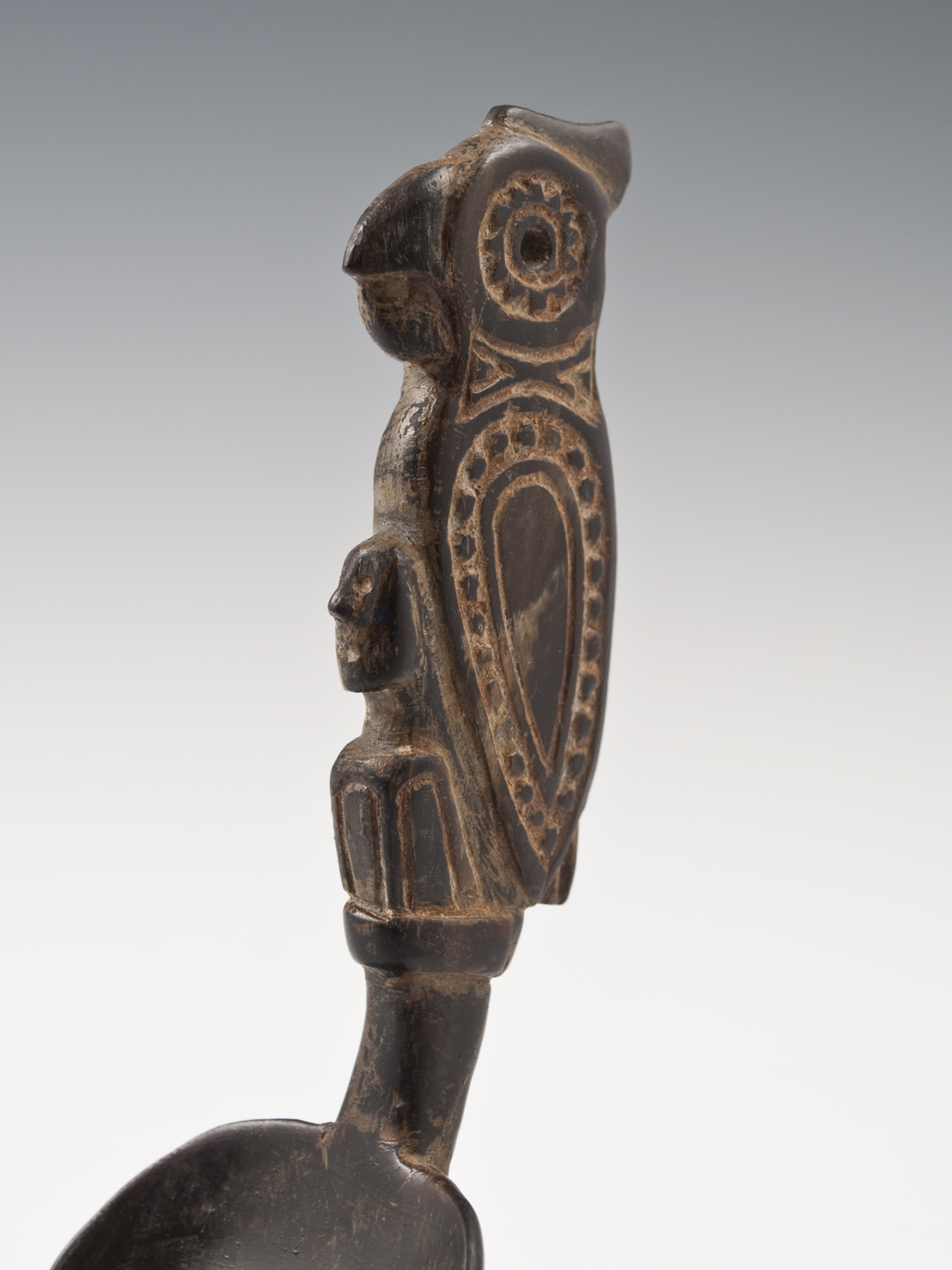 Published in The Art of the Lesser Sundas by Anthony F. Granucci, p. 192. Here is his description: "The handle of this small spoon is in the shape of a parrot or cockatoo. In front of the bird is a small figure of a human being. The overall impression is that the bird is protexcting the human. Perhaps this is an image of a soul bird, which helps carry the sould of the dead into the afterlife."