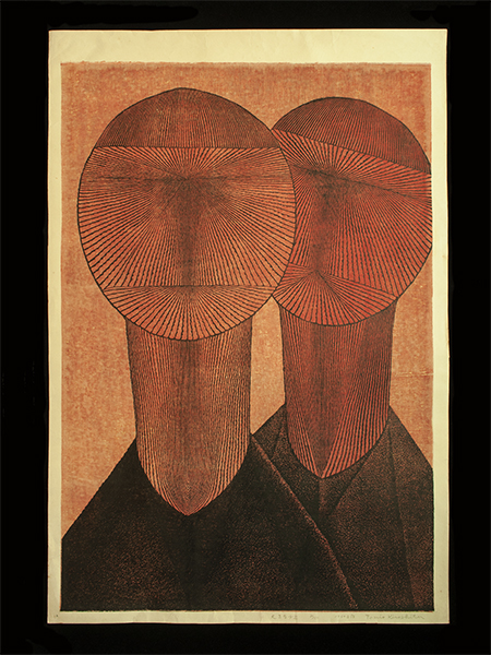 One of his students has written, “As time progressed further, the postwar era saw improvements in nutrition, and children became taller and heavier than in the past, but their lack of physical exercise and severely inferior physical abilities became a social problem; this is ironically depicted in Big Boys.” In 1963, Kinoshita told him that he had just finished pulling a print of this image in response to a request from Unichi Hiratsuka, one of the leaders of the sosaku hanga movement, who was living in the U.S. at the time.