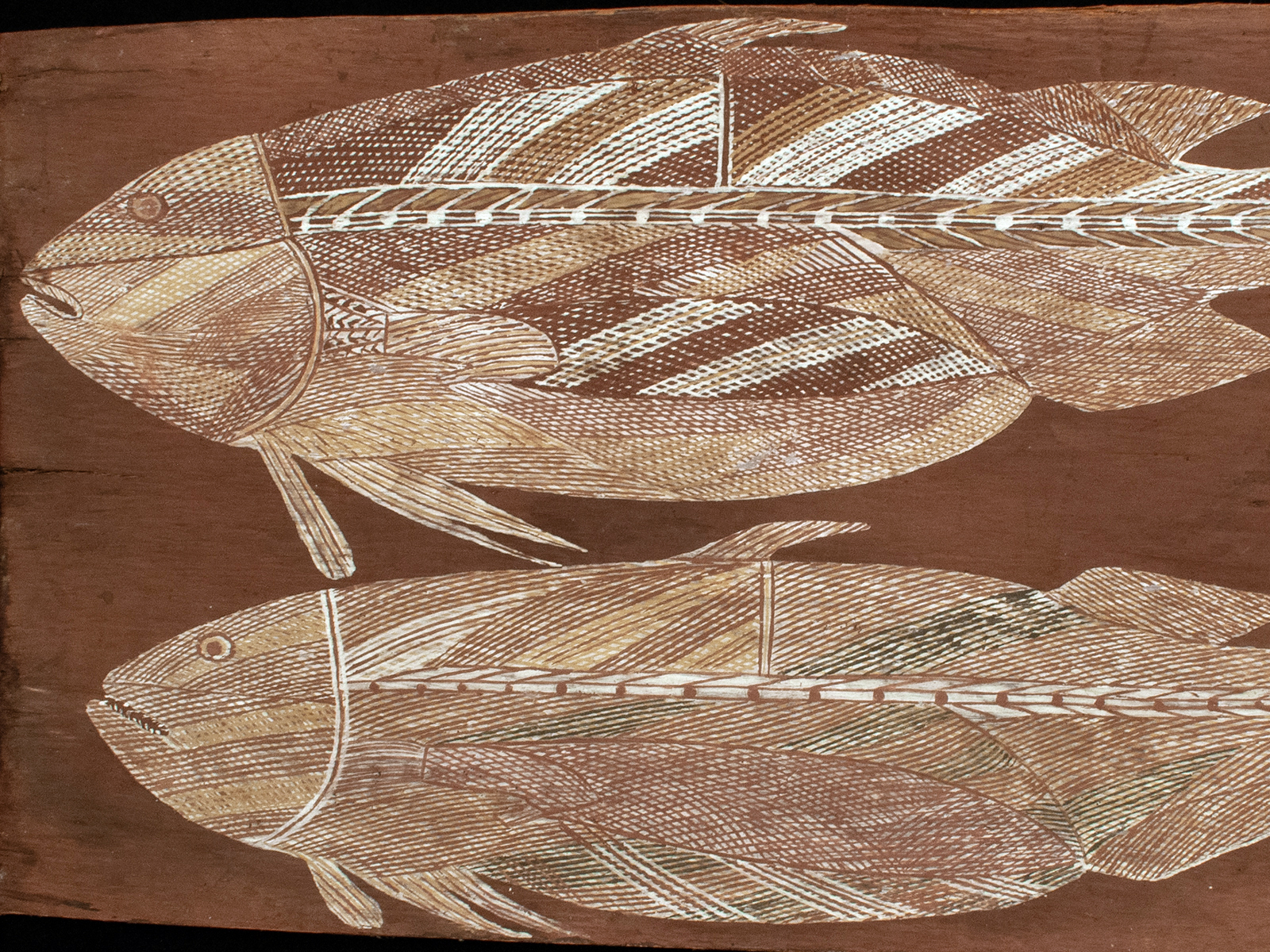 A wonderful "x-ray" bark painting of two fish, probably Barrumundi. This is painted in a the traditional style and with the use of cross-hatching or rarrk. Although it is not signed, it was purchased with a group of Bobby Ngainjmirra bark paintings in Queensland, Australia, in the 1970s.