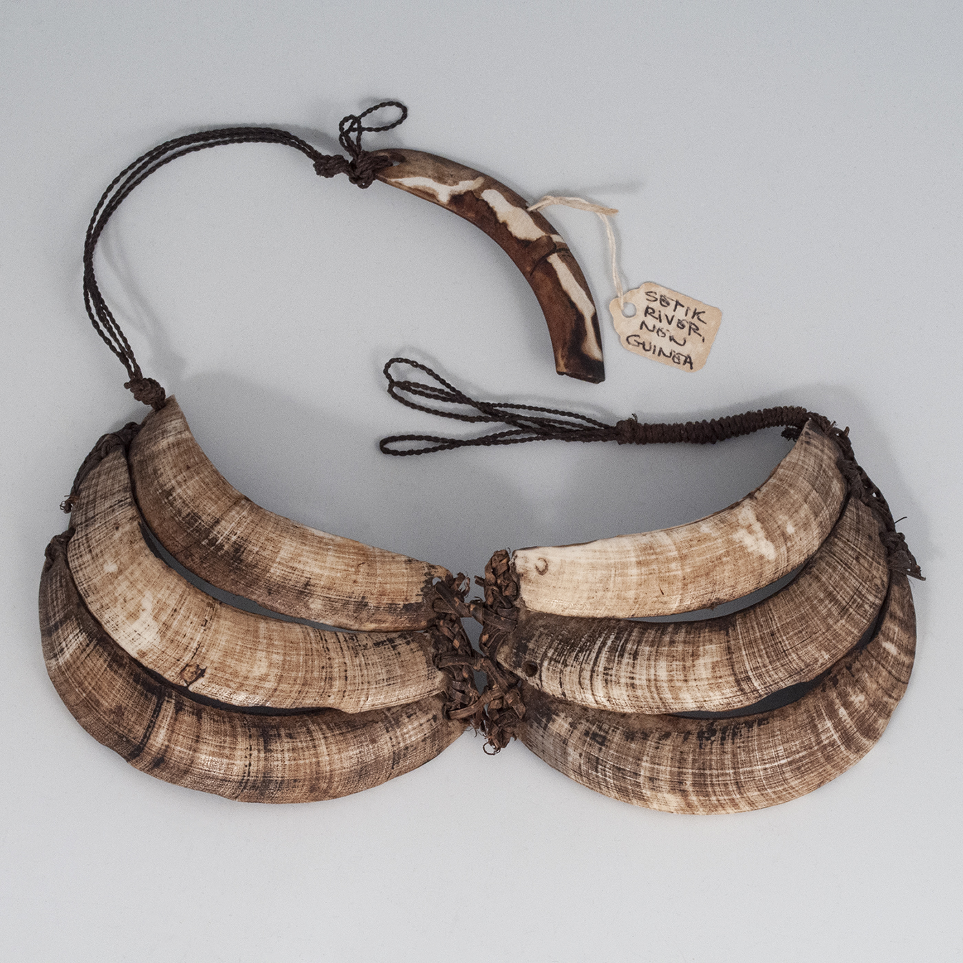 Three tusks on each side are joined at the center and on the edges with bush fiber. String is knotted to a piece of shell, which may have served as a clasp, now broken. Ex Leo and Lillian Fortess collection, Hawaii.