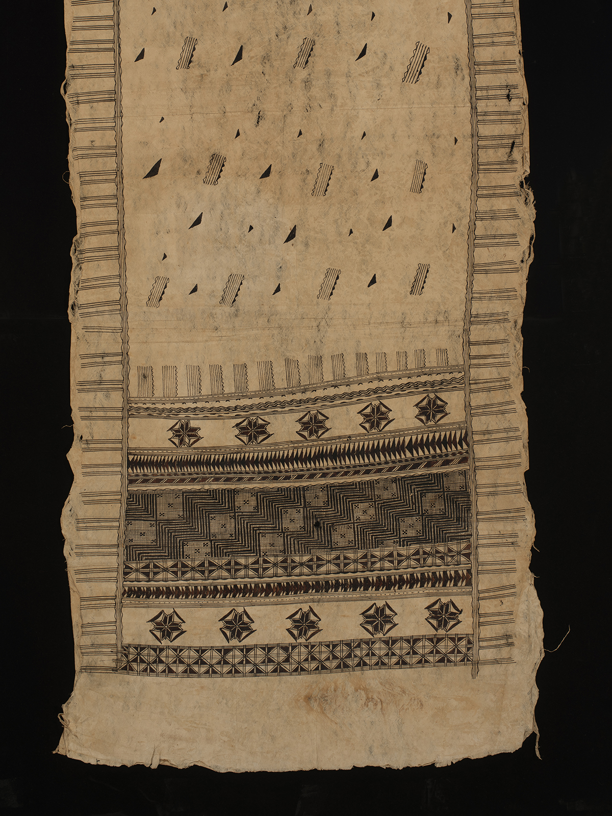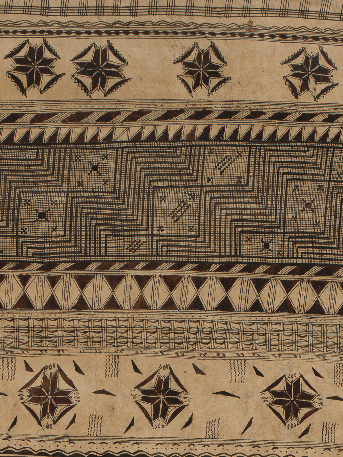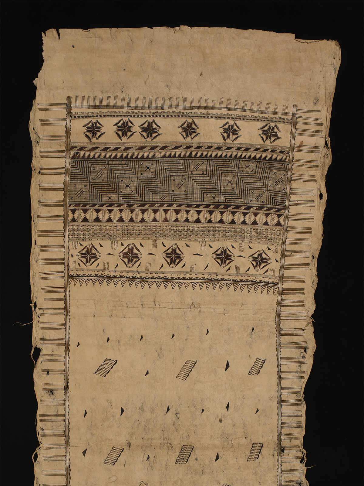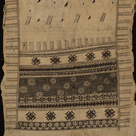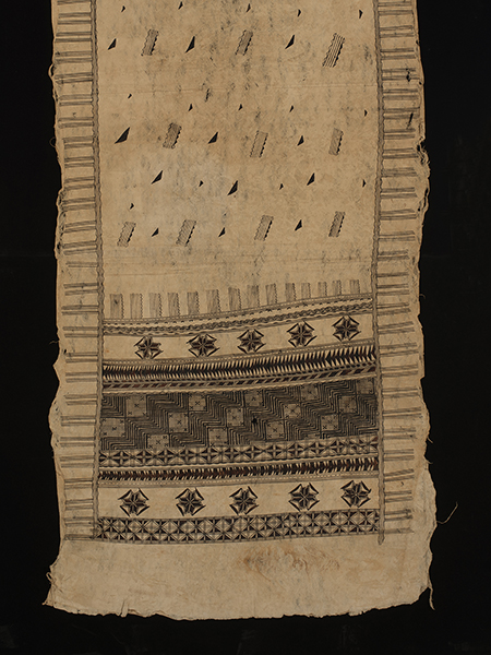 This rare Futuna Island tapa cloth is made from paper thin mulberry bast called lafi and is decorated with fine black hand-drawn motifs using a narrow pen cut from a coconut fond midrib. The center field is scattered with freehand painted designs and the complex border areas have bands of intricate patterns in fine black lines and small areas filled with brown ink.
