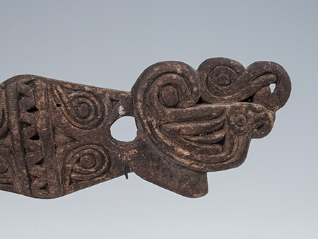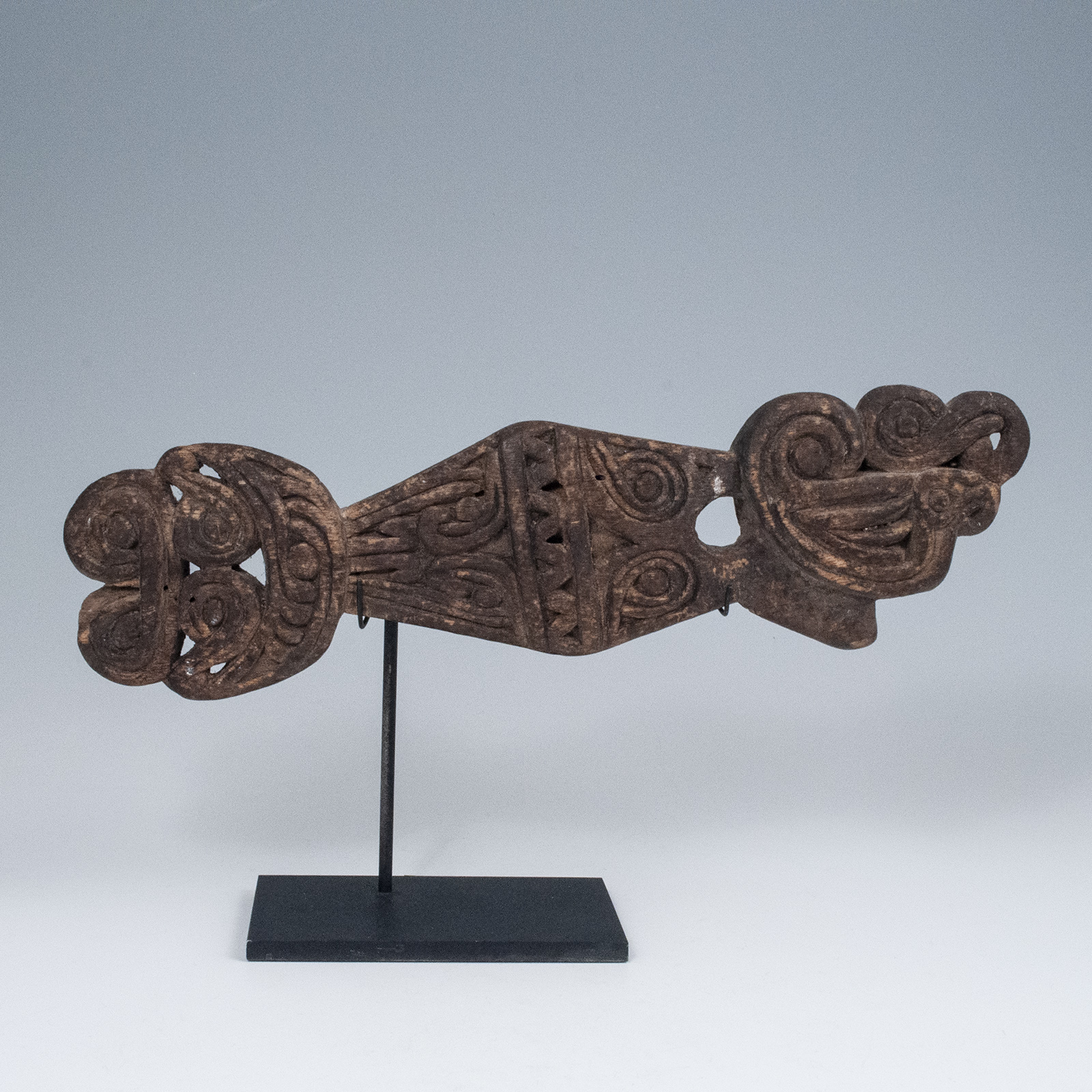 This net float was used to fish for dugong and was imbued with magical powers, as it was placed in the center of the net as the only carved float. It has a double bird head motif at one end and the dry patina of wood used in salt water. Additional photos courtesy of Franck Marcelin.