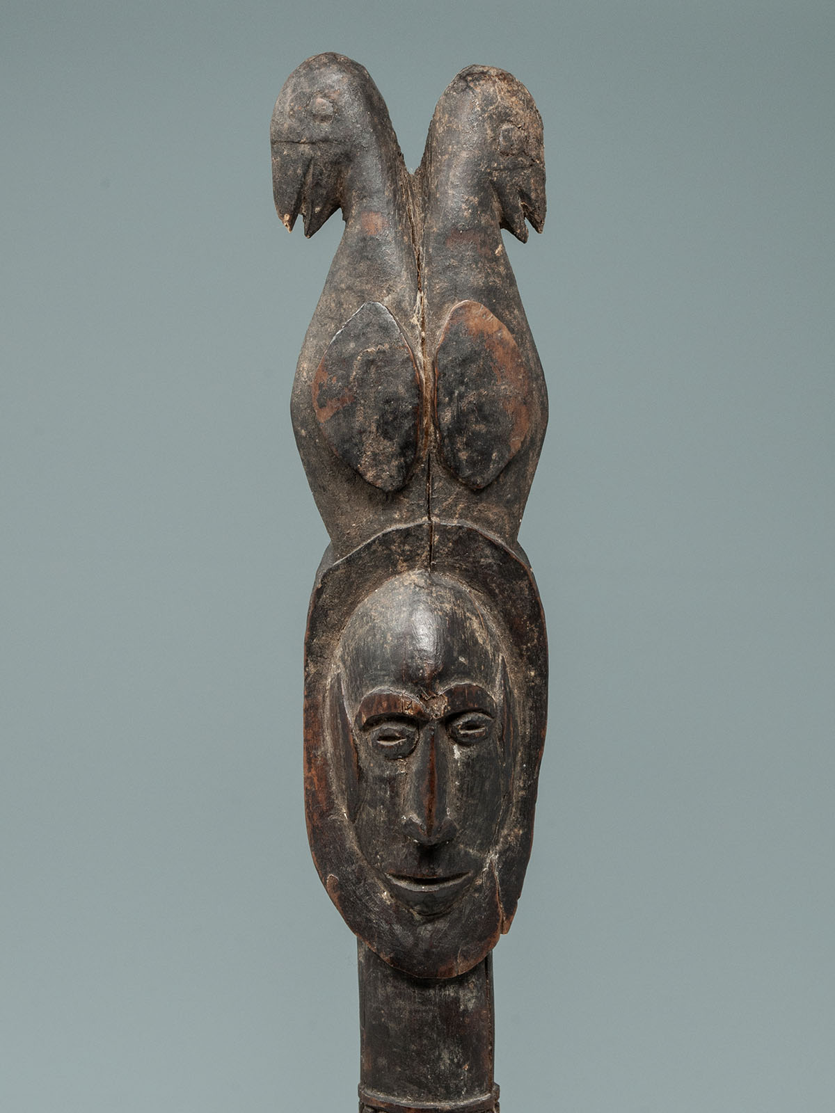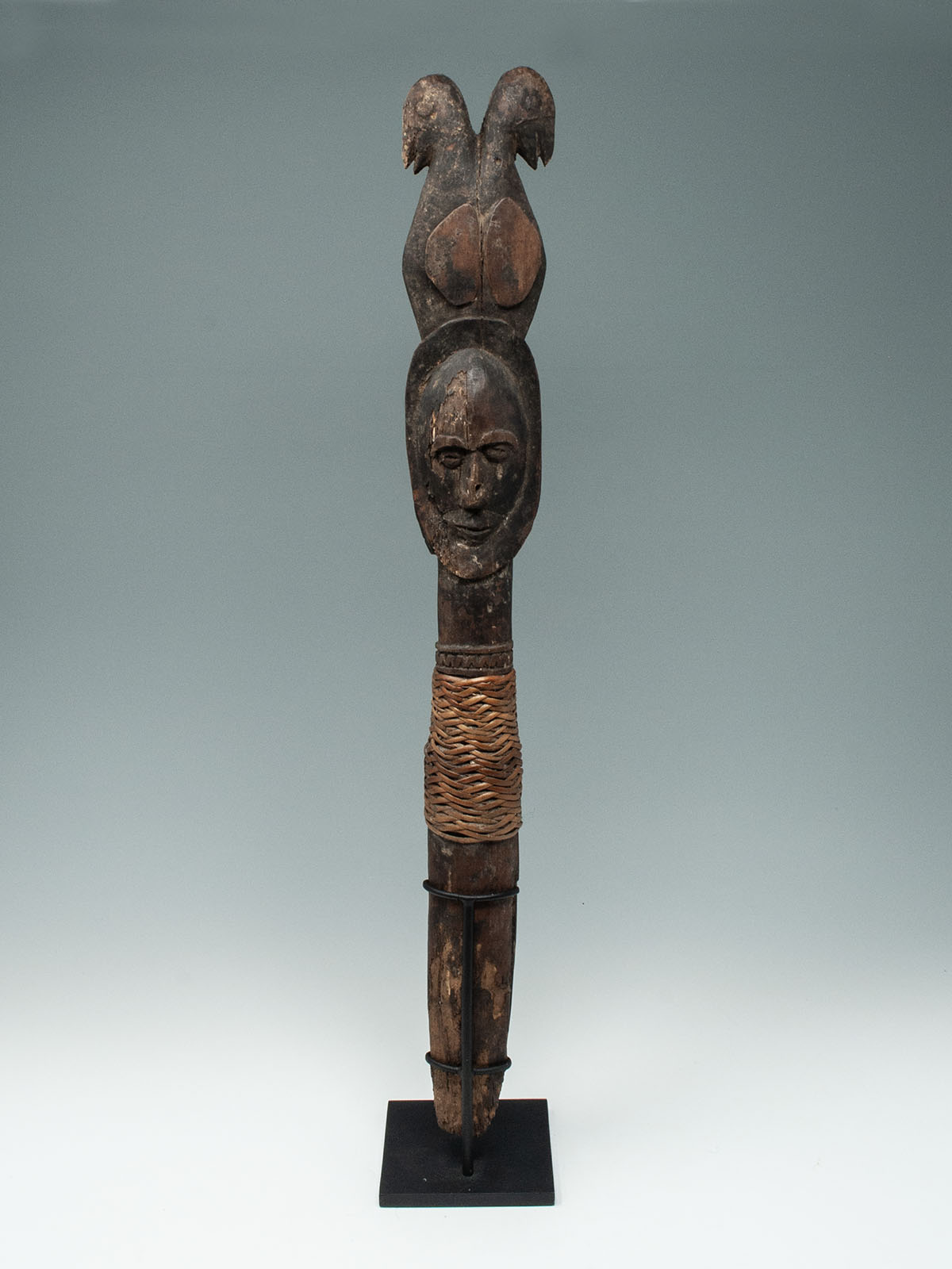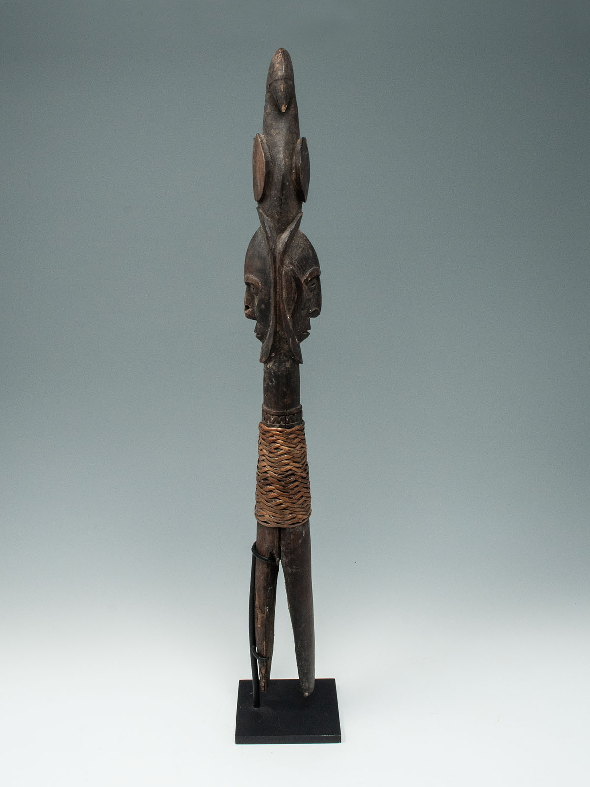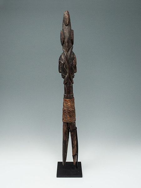 Sago pegs are used to secure a screen mesh during the preparation of sago flour. This example depicts a Janus-faced ancestor with a twinned bird crest. There is evidence of old insect damage on the back side.