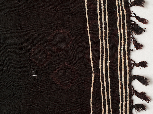 henna along the fringed edges, which can be barely seen, and it makes the entire area a little redder than the field. There is a native repair on the lower edge, obviously made for strength rather than invisibility, indicating that it was used after the repair. A textile conservator can repair the tear so that it can barely be detected; this can be arranged if desired. There is one small hole near the right end center.