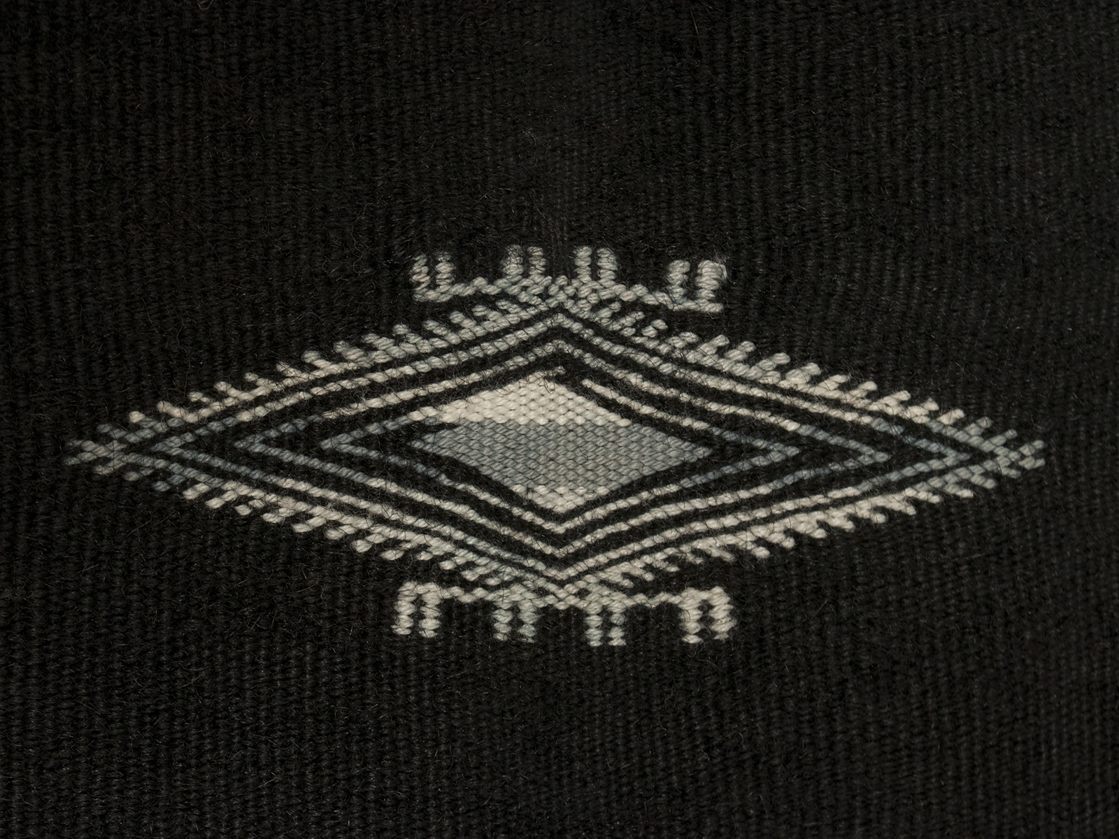 This baknough is most likely from Libya, although similar pieces have been attributed to Tunisia; it was purchased from a very knowledgeable textile dealer on Djerba Island. The supplemental cotton patterns are sewn with cotton thread unevenly dyed with indigo, which can be clearly seen in the detail photos below. The last photo is the back side of the piece, which shows how skillfully the patterns are stitched.