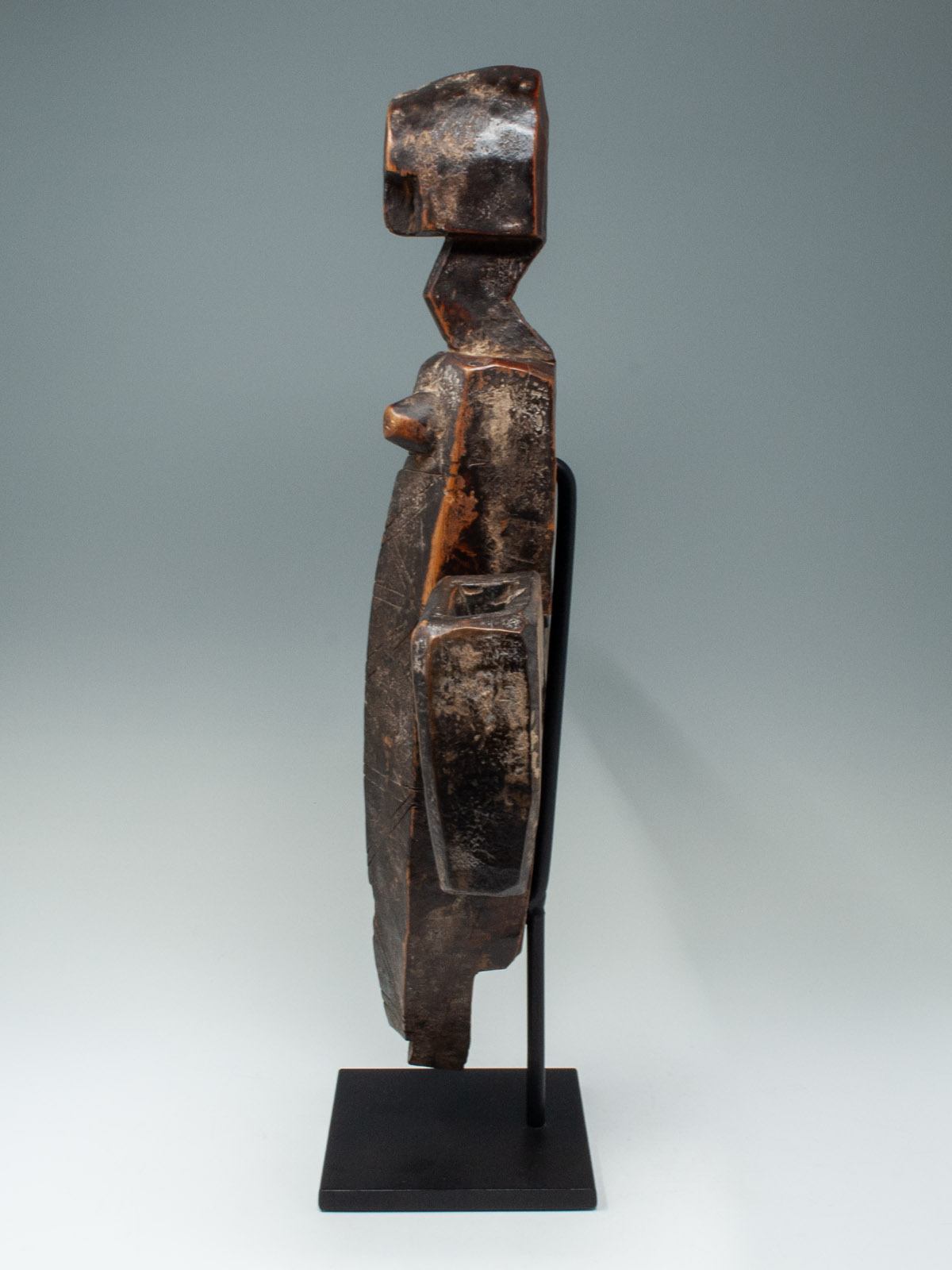 A figurative wood door lock from the Bamana (Bambara) people of Mali. This probably depicts a female ancestor whose features are conveyed in a very simple abstract form. Her neck from the side view has a marvelous crook, and she comes with a custom metal stand.