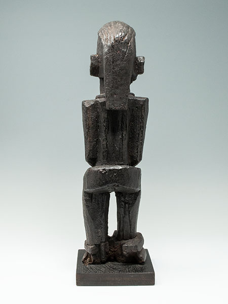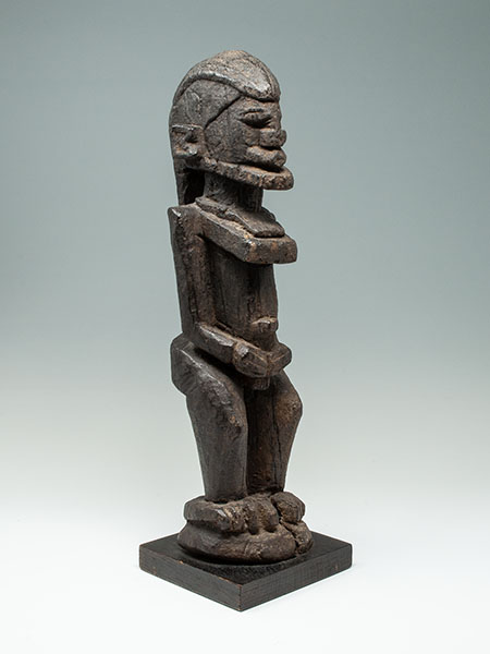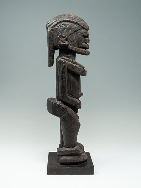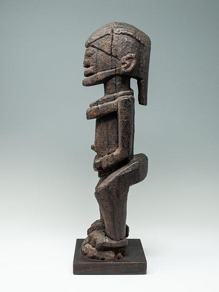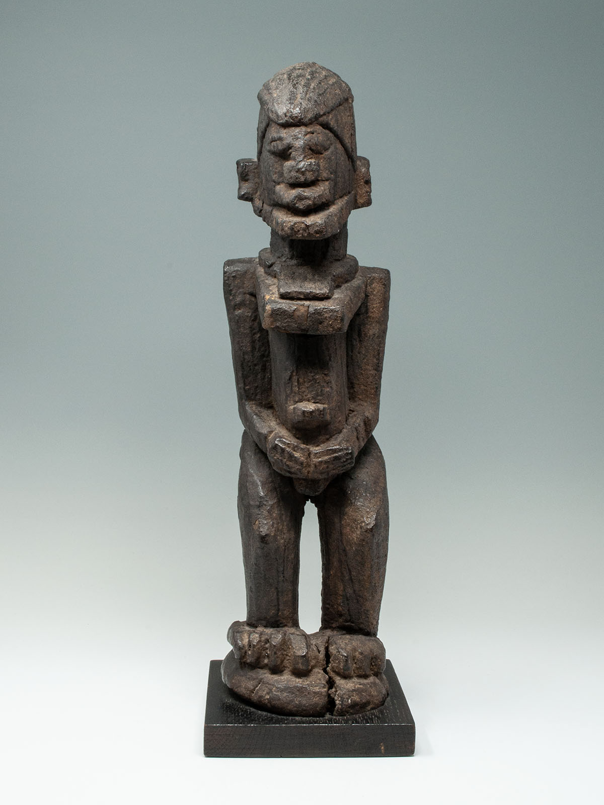 As translated from the French, “Representing a hermaphrodite figure standing, with a bearded face, the hairstyle falling to the back of the head, the arms and chest especially geometrical. Dogon statues evoke mythical ancestors. Maintained in sanctuaries, they are regularly honored to bring help and prosperity to the living.”
