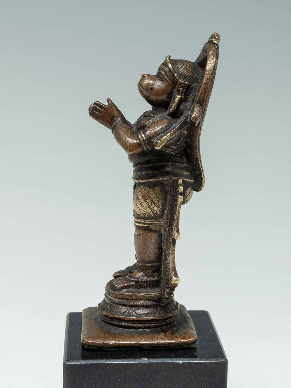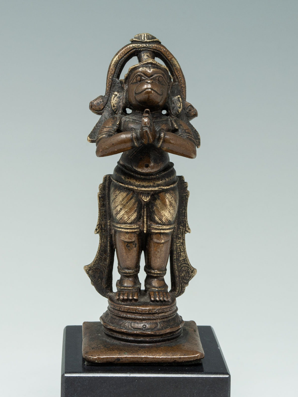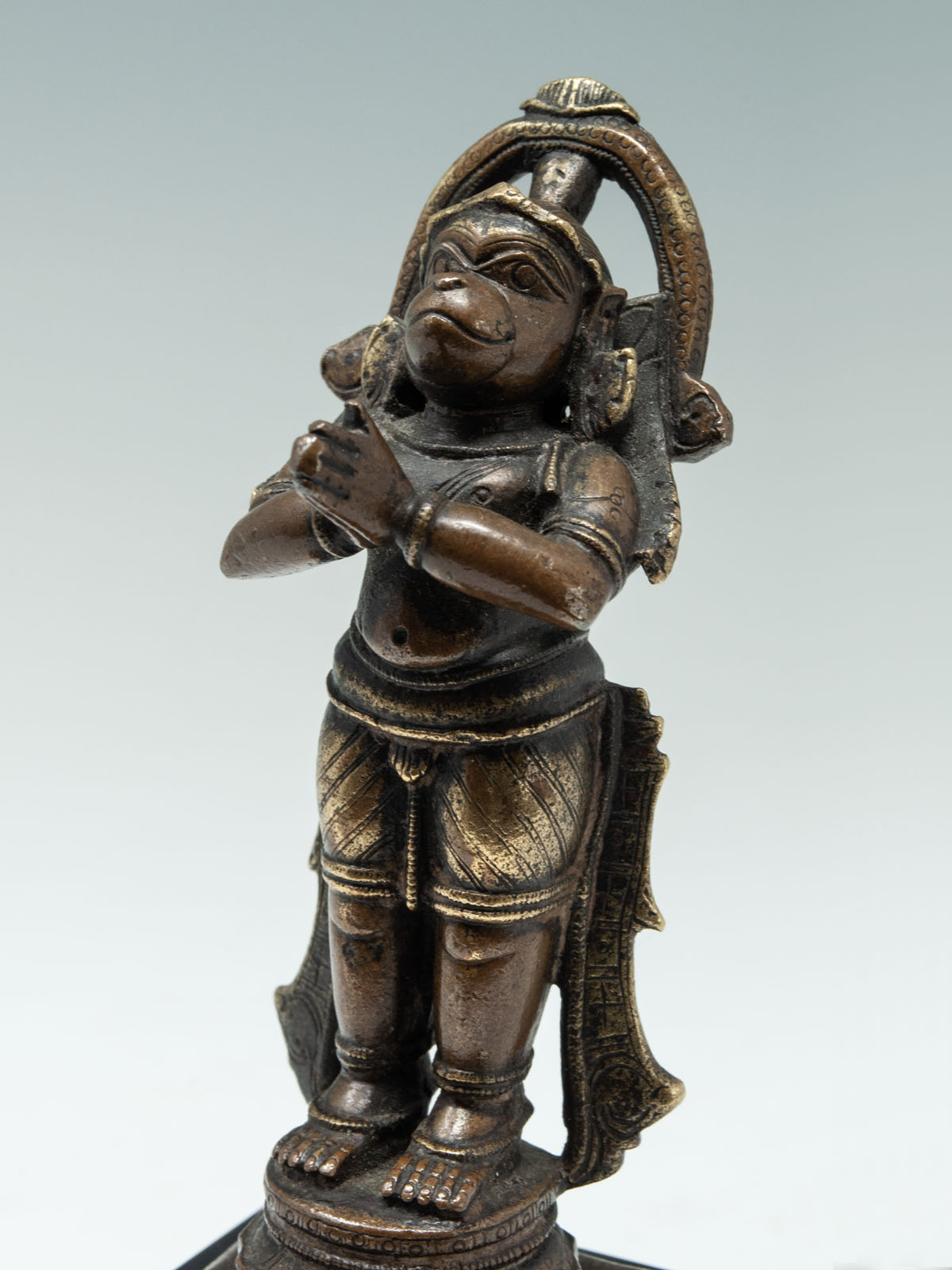 This is an unusual Hanuman figure made using the Ganga Jumna technique, combining copper and brass, which was named after the confluence of the Ganga and Jumna Rivers. He stands in Samapada with his hands in the prayerful anjali mudra. There are residues of incense and tikka powder from worship.