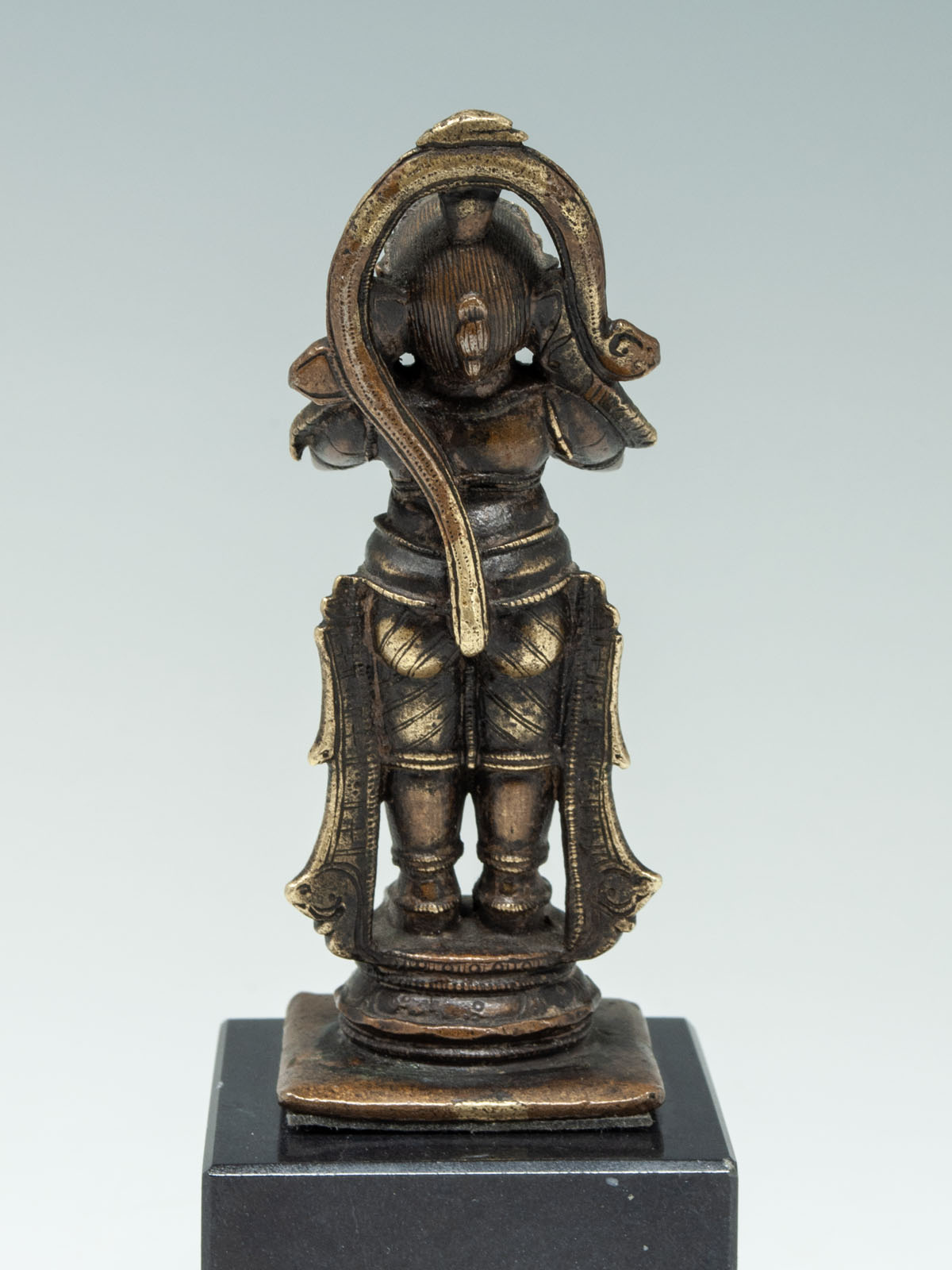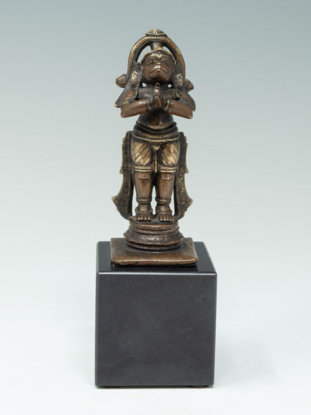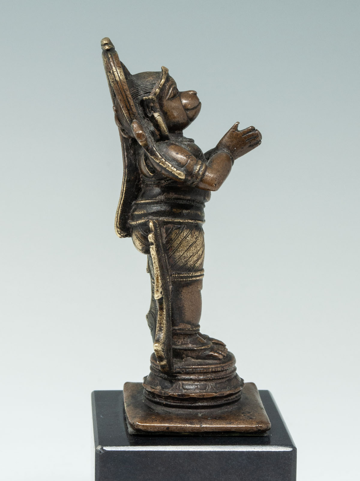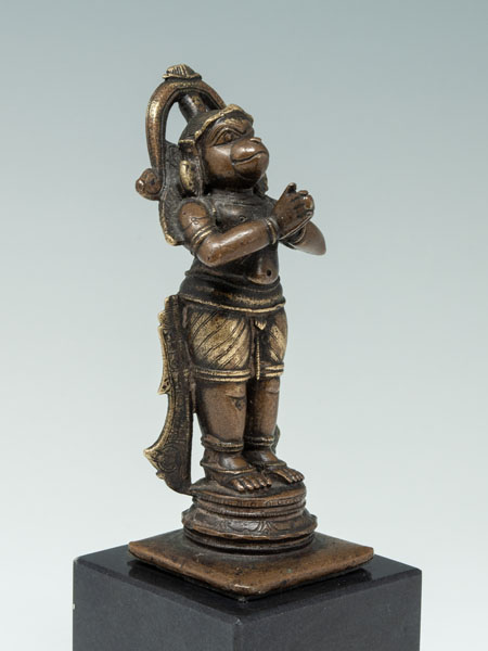 This is an unusual Hanuman figure made using the Ganga Jumna technique, combining copper and brass, which was named after the confluence of the Ganga and Jumna Rivers. He stands in Samapada with his hands in the prayerful anjali mudra. There are residues of incense and tikka powder from worship.