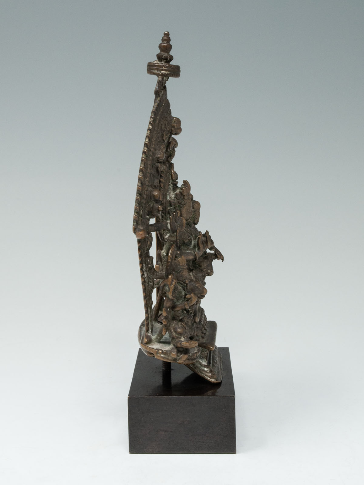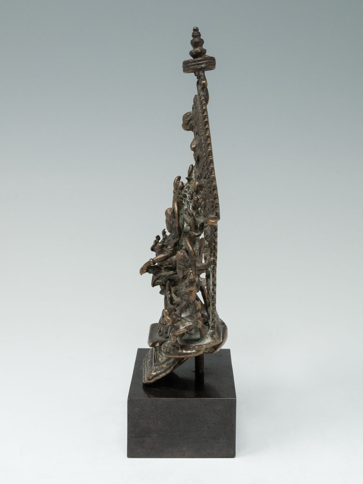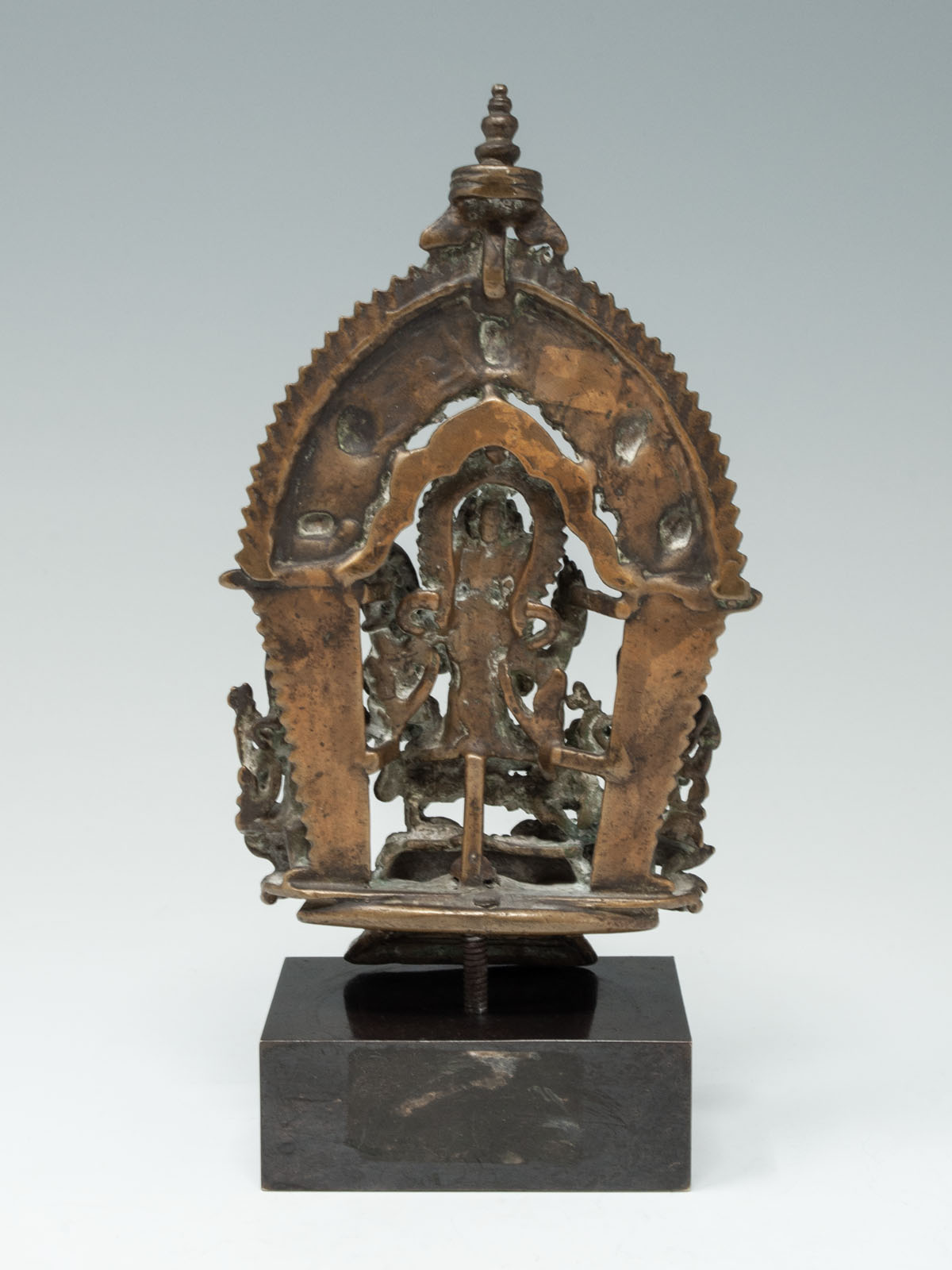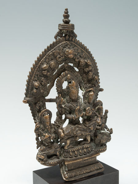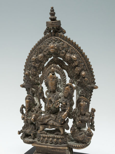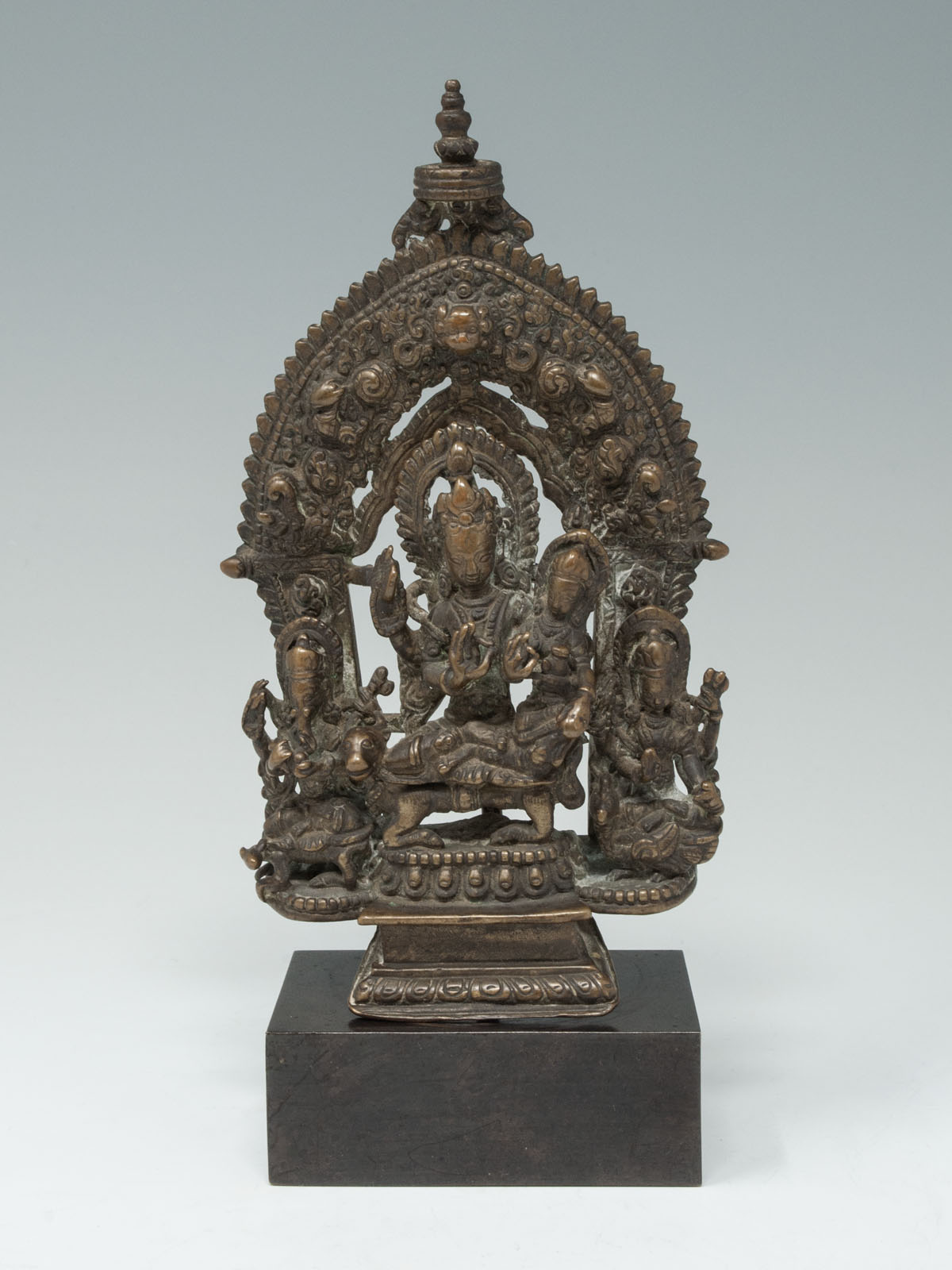 A shrine with Shiva seated in lalitasana on a lotus throne, his right leg resting upon his bull Nandi, while he embraces his consort Parvati seated upon his lap.They are flanked by their children Skanda (on his transport peacock) and Ganesh (on his transport rat) who are seated on either side, under an ornamented prahbha. The piece is bolted onto the base and if tightened down, would sit upright.