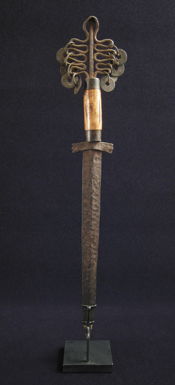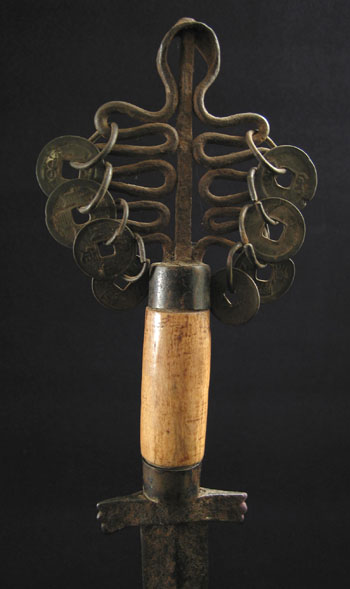 This is a priest's ceremonial dagger from the Mien Yao people of China, Laos and Thailand. These daggers were used to fend off evil spirits; when shaken by the priest, the coins rattled and made quite a noise. It measures 19" in height and is made of iron and bone. Please see additional views below. Early 20th century. #2604 $875 |